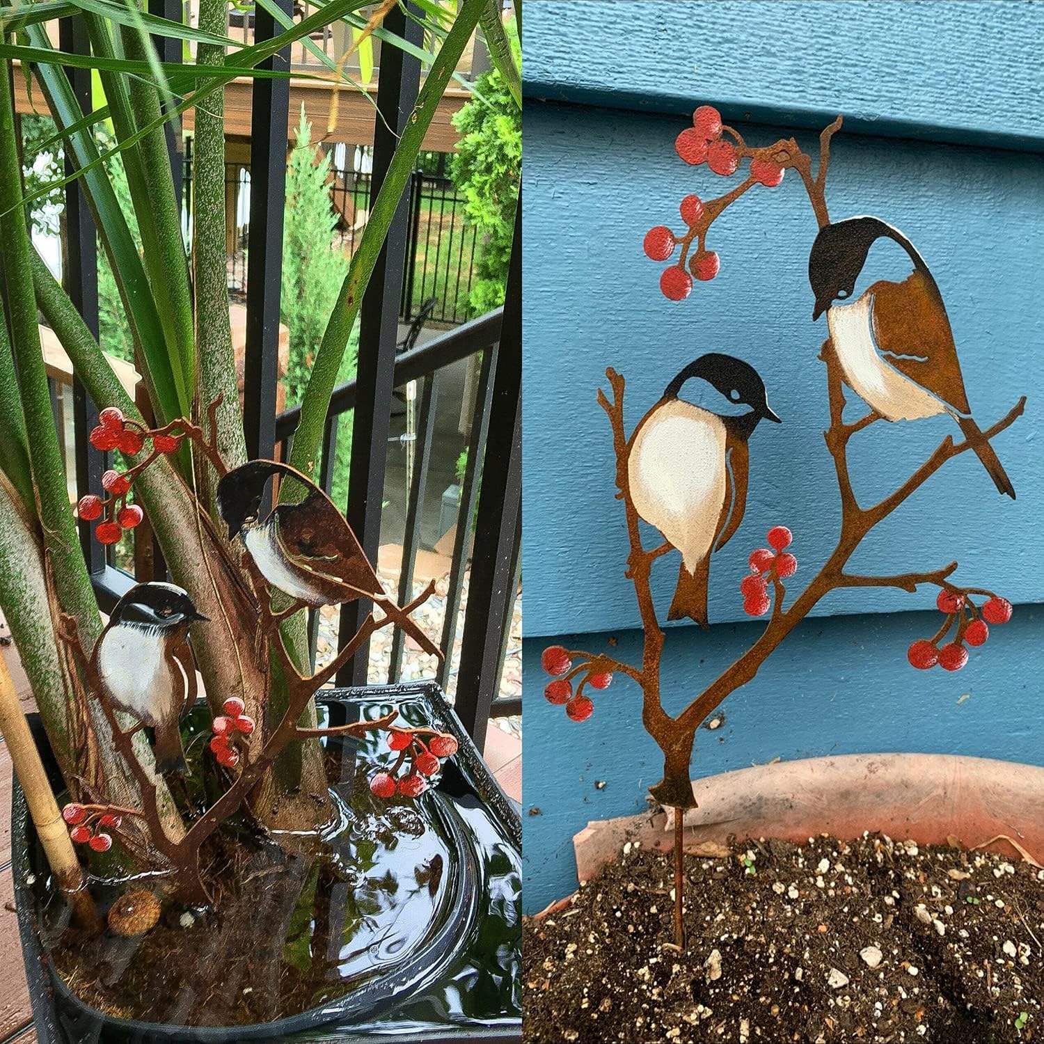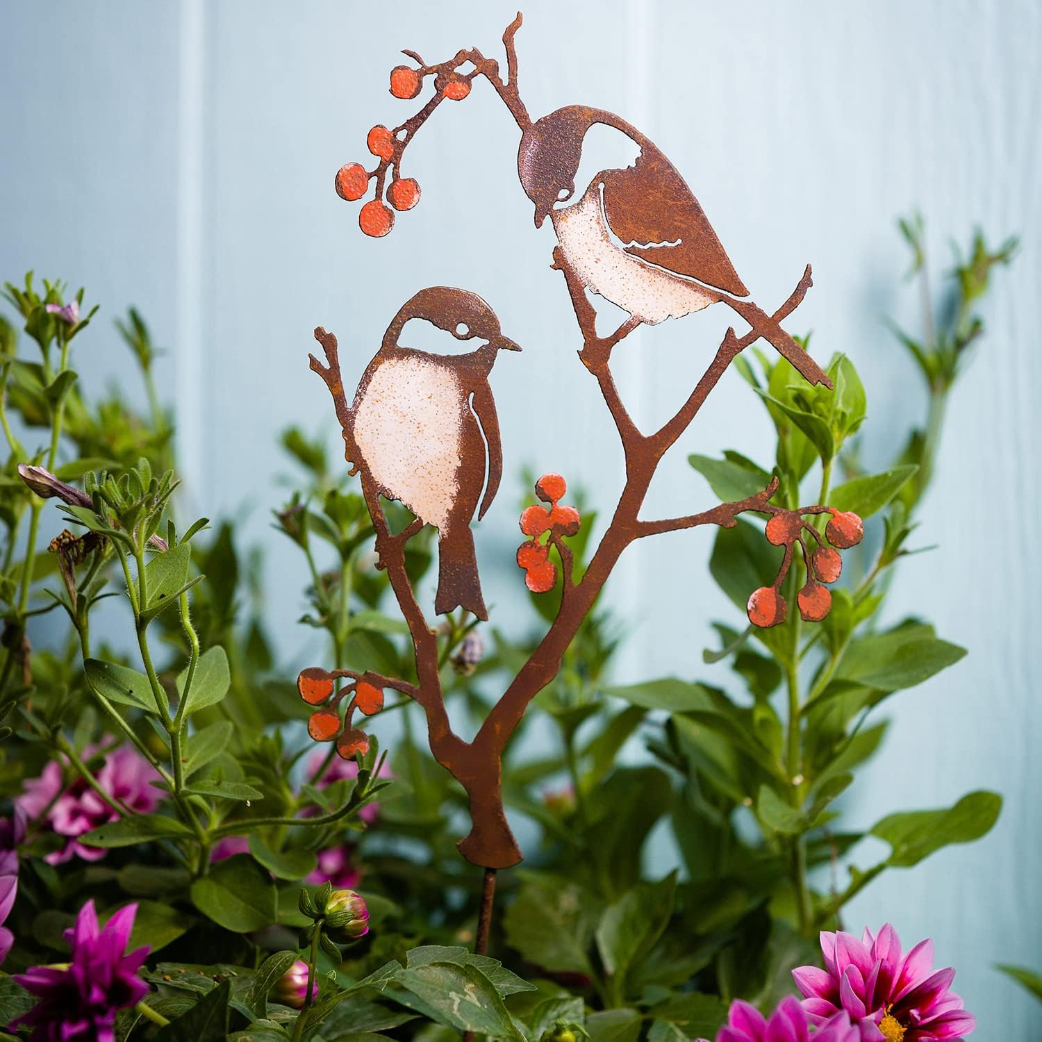 Chaque pièce est peinte des deux côtés avec des peintures métalliques spéciales. Taillés dans de l’acier recyclé, les petits oiseaux ont été prétraités pour obtenir une surface authentique.