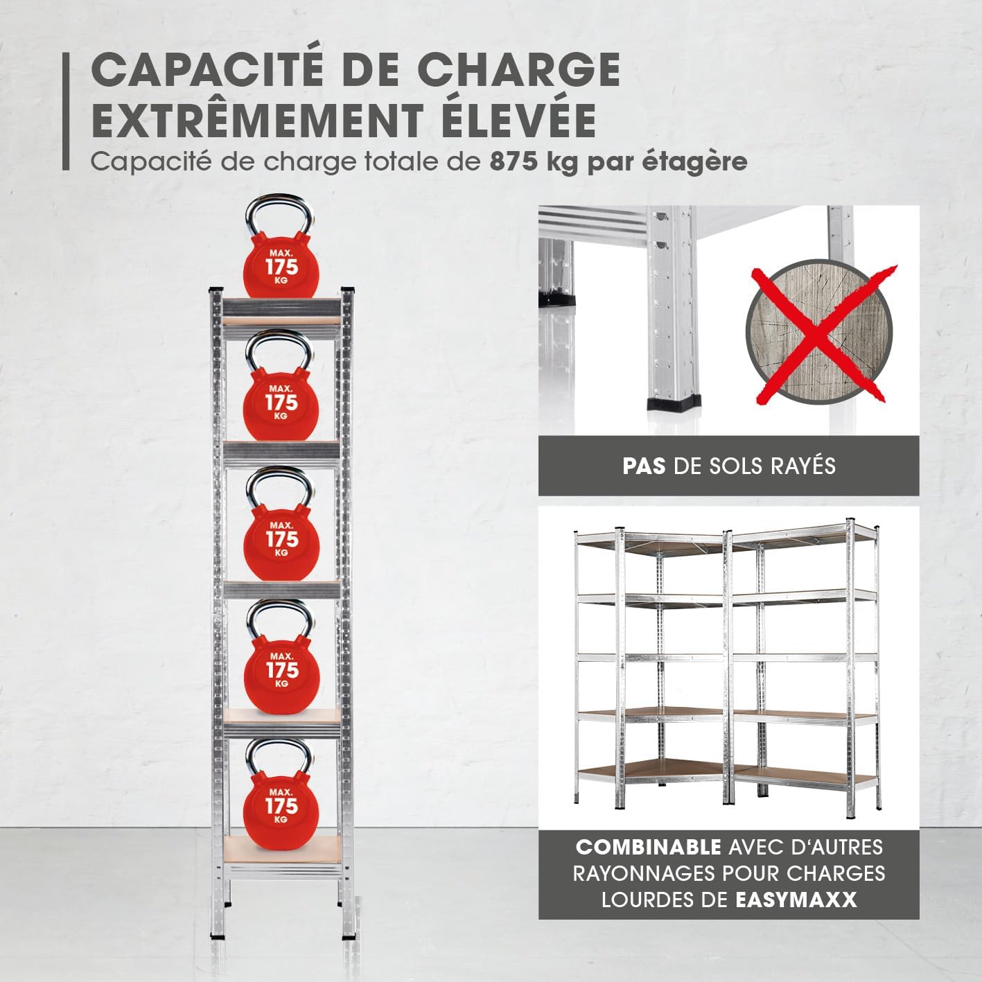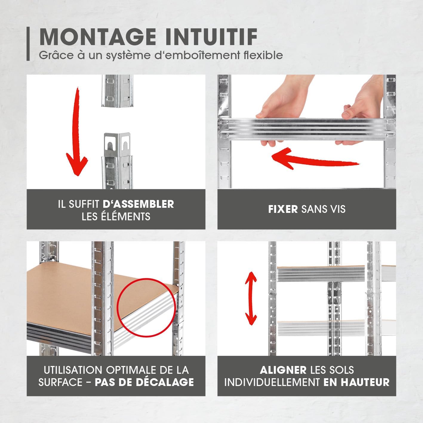 Montage facile sans outils : grâce au système d’emboîtement ingénieux, l’étagère pour charges lourdes peut être facilement montée en un tour de main sans vis ni perçage, et grâce aux pieds en plastique inclus, votre sol est protégé des rayures.