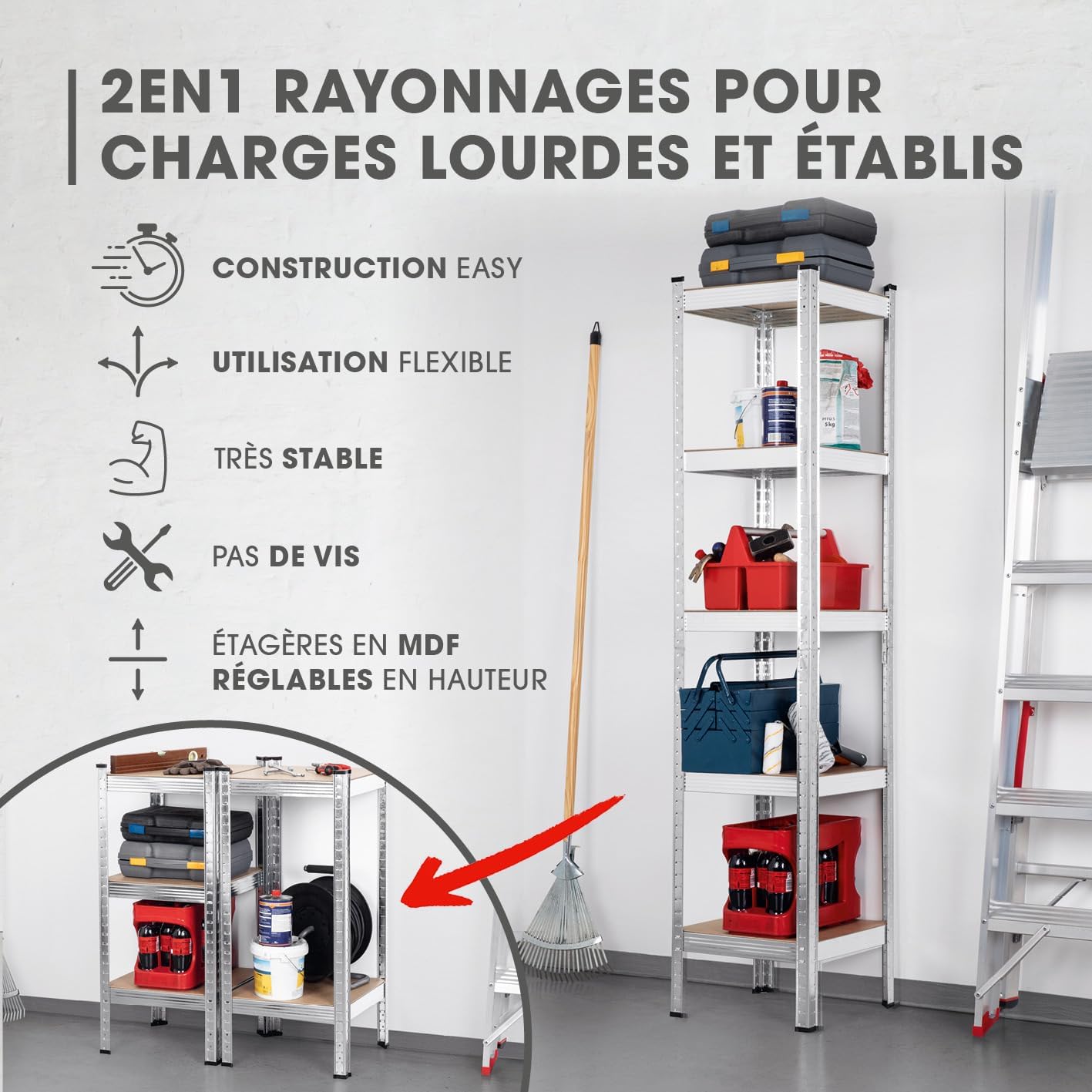 Rangement et espace : créez la solution de rangement optimale ! Avec l’étagère à charges de EASYmaxx vous pouvez mettre de l’ordre en quelques étapes seulement. Idéal pour ranger des outils, des pneus de voiture, des fournitures, des boissons, des fichiers, des fournitures de jardin ou des ustensiles de cuisine.