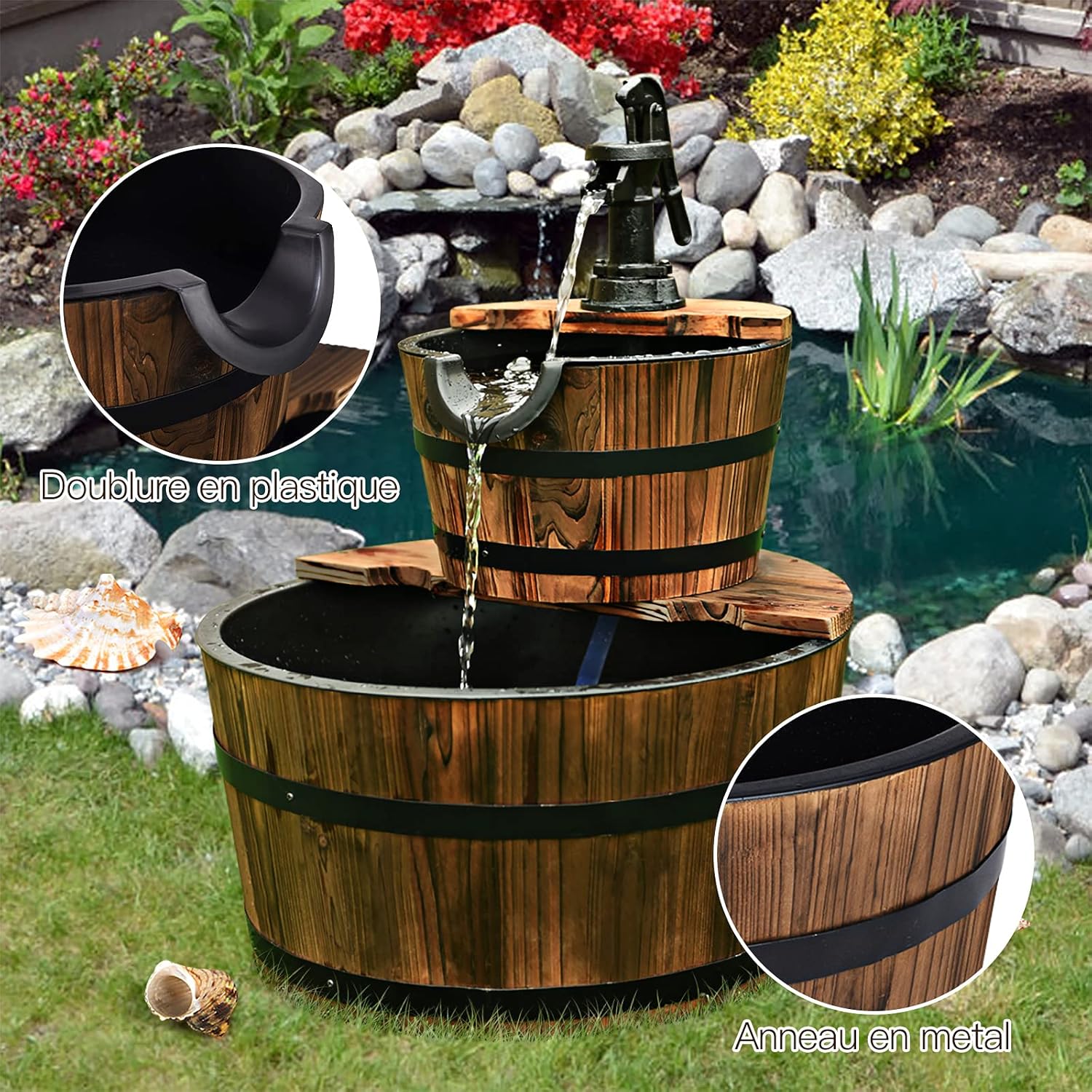 Souhaitez-vous ajouter une touche d’ambiance naturelle et agréable à votre jardin? Notre fontaine en bois sera un choix idéal. Notre fontaine est fabriuqé de sapin carboniséour une longue durée de vie. L’eau peut circuler et la vitesse de l’eau peut être réglée via un bouton. La doublure en plastique et les cerceaux de baril en fer autour du seau peuvent empêcher le bois d’absorber l’humidité et les fuites d’eau. Le design unique à 2 couches ajoute une touche de simplicité et d’élégance à votre jardin. L’eau en circulation peut vous apporter un plaisir visuel et auditif. Profitez de notre fontaine en bois pour créer votre style pastoral unique!