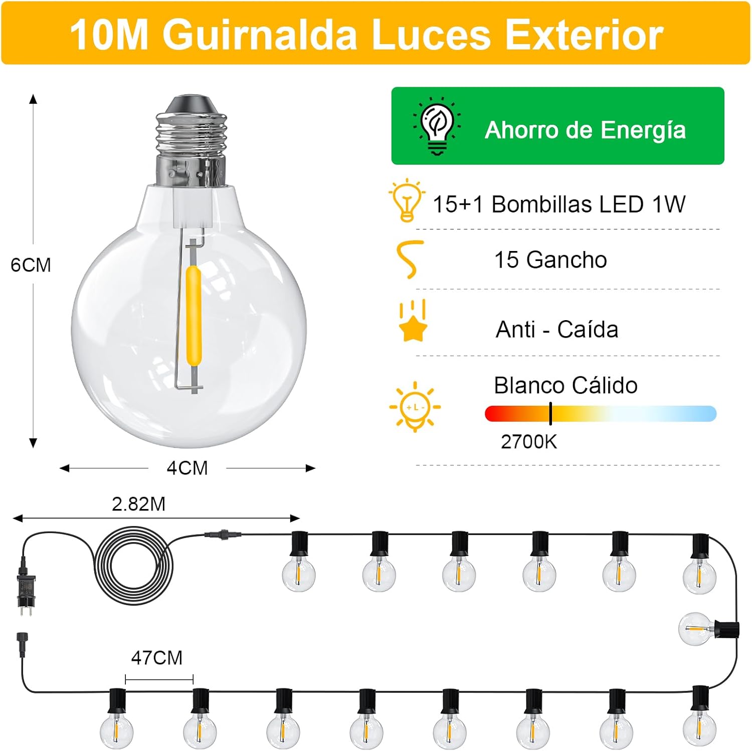 【Connectable】La guirlande lumineuse parfaite pour sublimer vos moments! Guirlande lumineuse exterieure est livrée avec 16 ampoules G40 brillantes de 40LM (venir avec 1 en réserve pour plus de tranquillité ). 2700K Lumière douce et chaude, idéale pour créer une atmosphère cosy. Et le plus beau, c’est qu’elles se connectent en chaîne sans limite, vous permettant de personnaliser la longueur à souhait pour magnifier votre jardin, terrasse, bistro charmant, tente romantique ou bar branché.