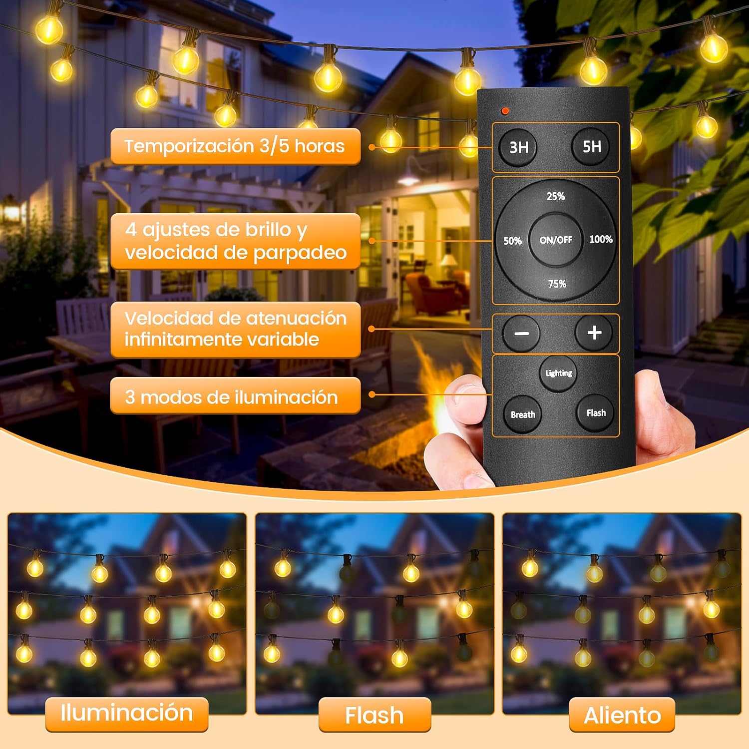 Économe & Installation Facile: Son câble en caoutchouc flexible, résistant aux hautes températures et au vieillissement, garantit sécurité et longévité. Chaque crochet de fixation s’installe en un instant avec colliers de serrage ou cordes (arbres, tentes, balcons). Attention: Utilisez uniquement l’adaptateur fourni (les autres risquent de griller les ampoules)
