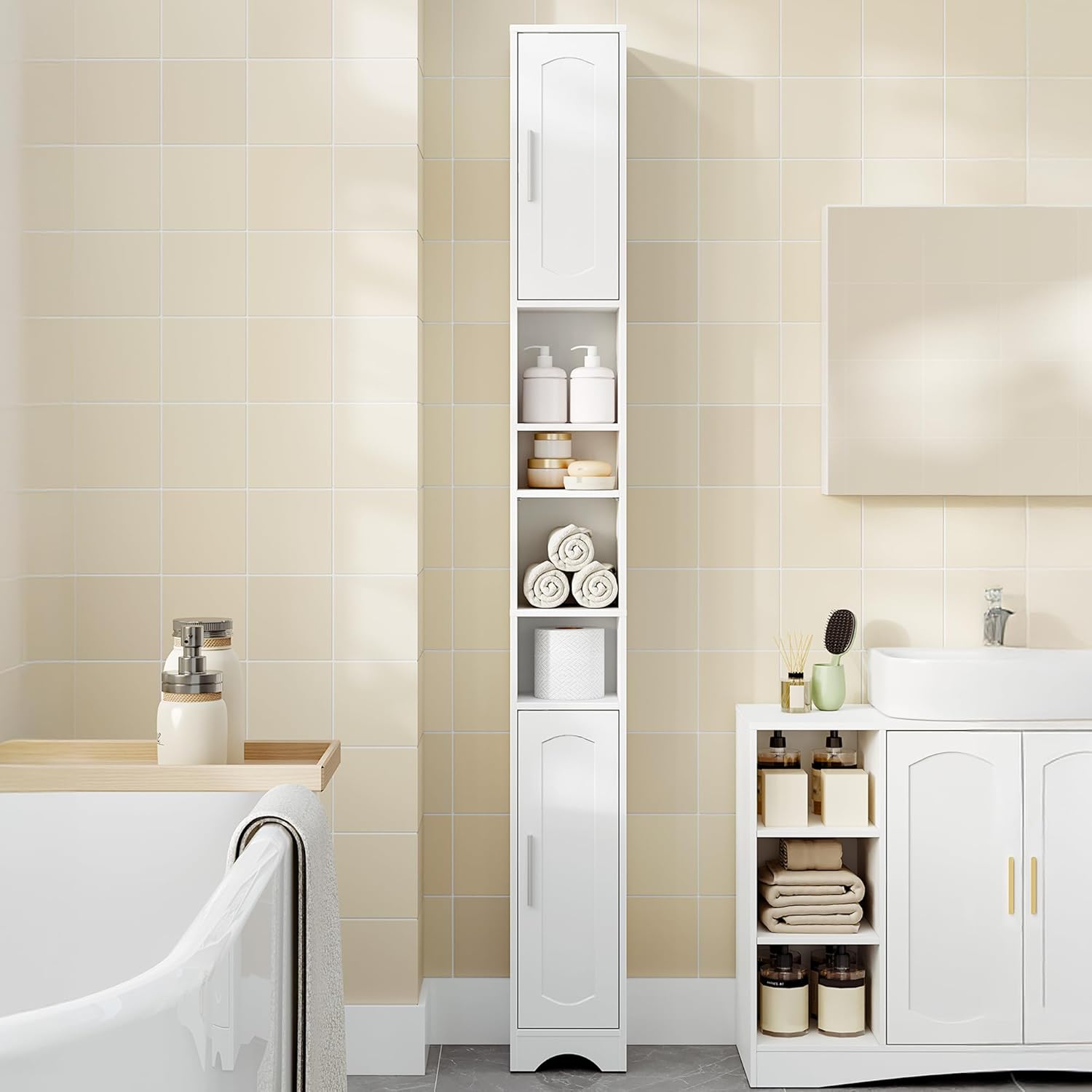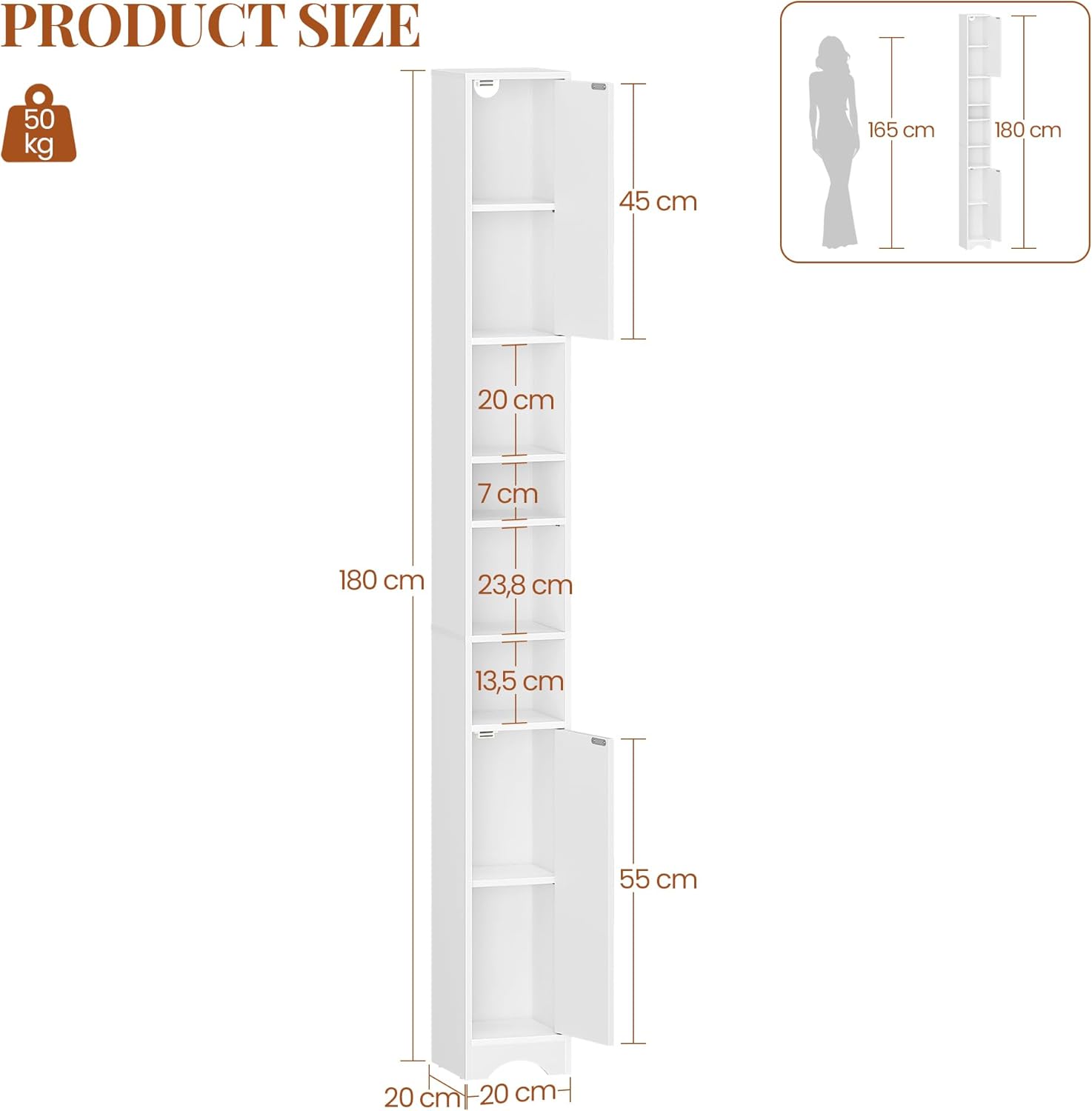 Beaucoup D’espace de Rangement : Le meuble colonne de salle de bains mesure 20 × 20 × 180 cm et comprend 2 portes de placard et 4 compartiments ouverts, offrant ainsi un vaste espace de rangement. Les compartiments ouverts peuvent contenir les objets fréquemment utilisés, et l’espace derrière les portes peut contenir les objets peu utilisés pour répondre au besoin de rangement caché et garder la salle de bains bien rangée