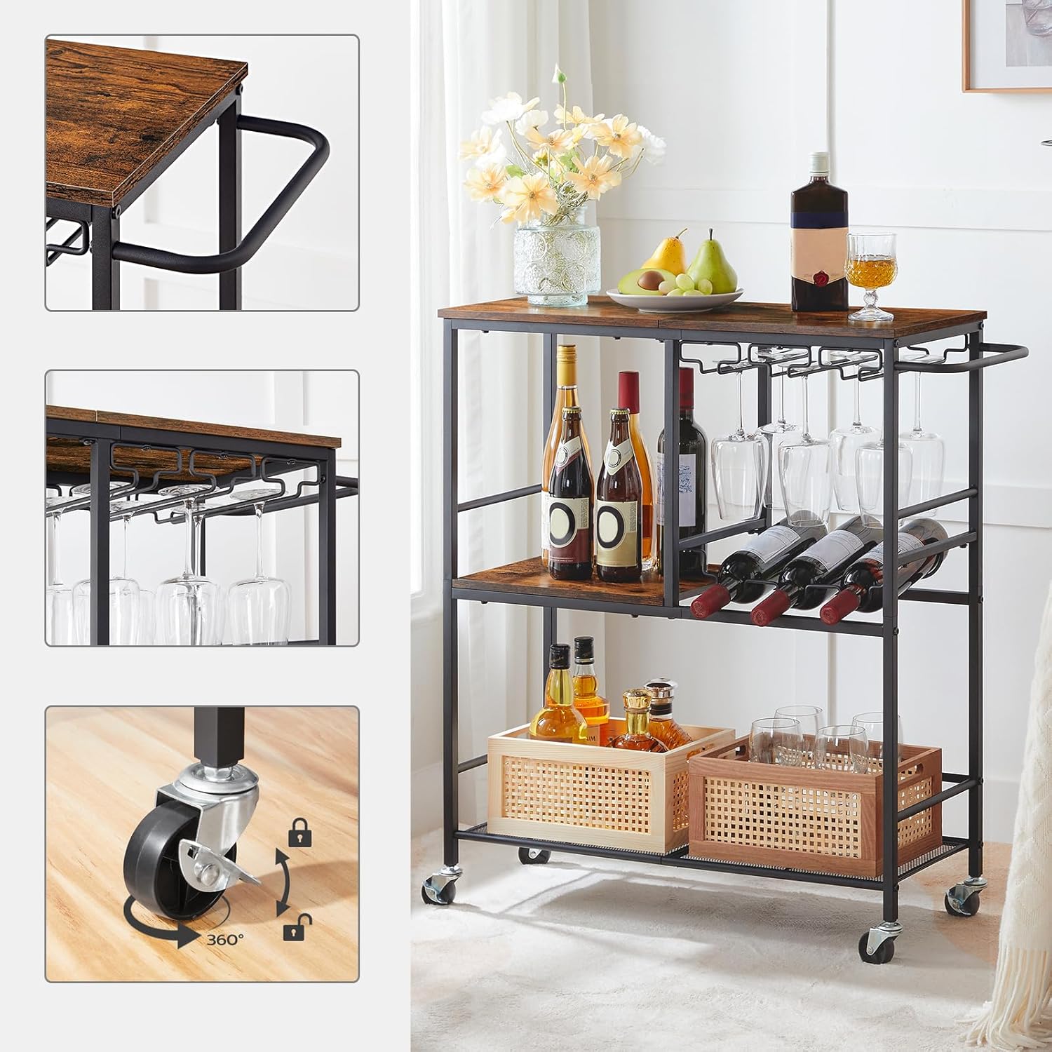 Libre de se déplacer et verrouillable : Le chariot à vin avec poignée latérale et 4 roues pivotantes (2 roues verrouillées) peut être déplacé librement, créant un sentiment de rituel dans la vie à tout moment, n’importe où