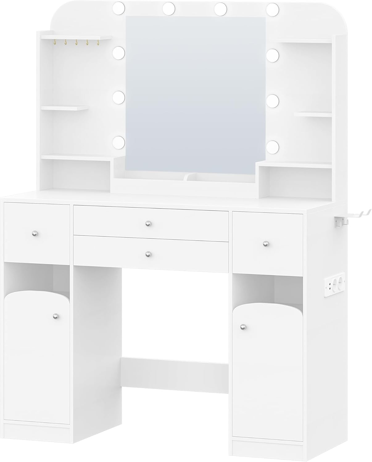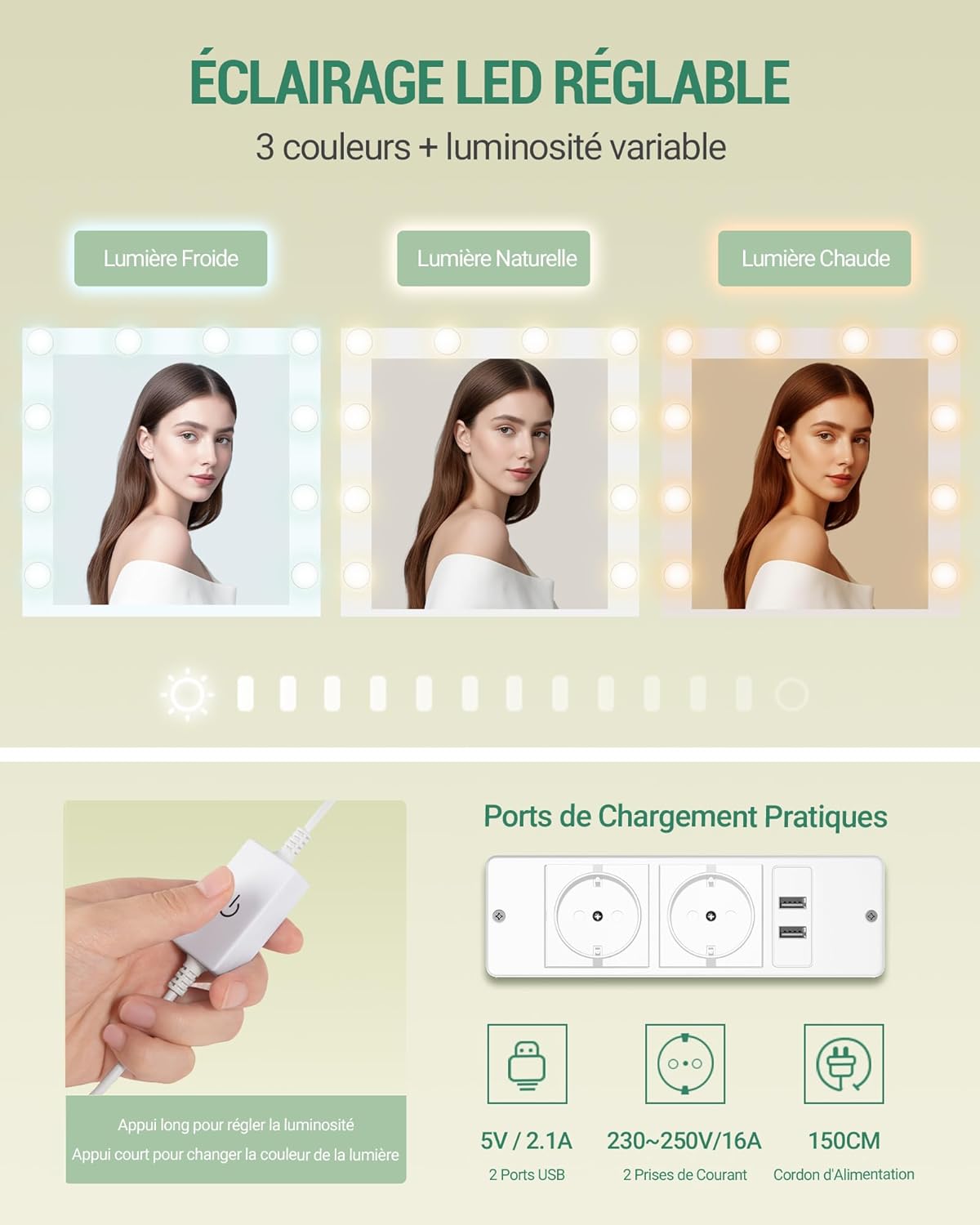 [Coiffeuse multifonctionnelle] Gardez vos essentiels à portée de main grâce à cette coiffeuse multifonctionnelle dotée de 2 prises de courant, de 2 ports USB et d’un support pour sèche-cheveux. Un éclairage doux et un miroir haute définition illumineront votre look. De nombreux espaces de rangement à gauche et à droite pour les soins de la peau, les cosmétiques et les bijoux