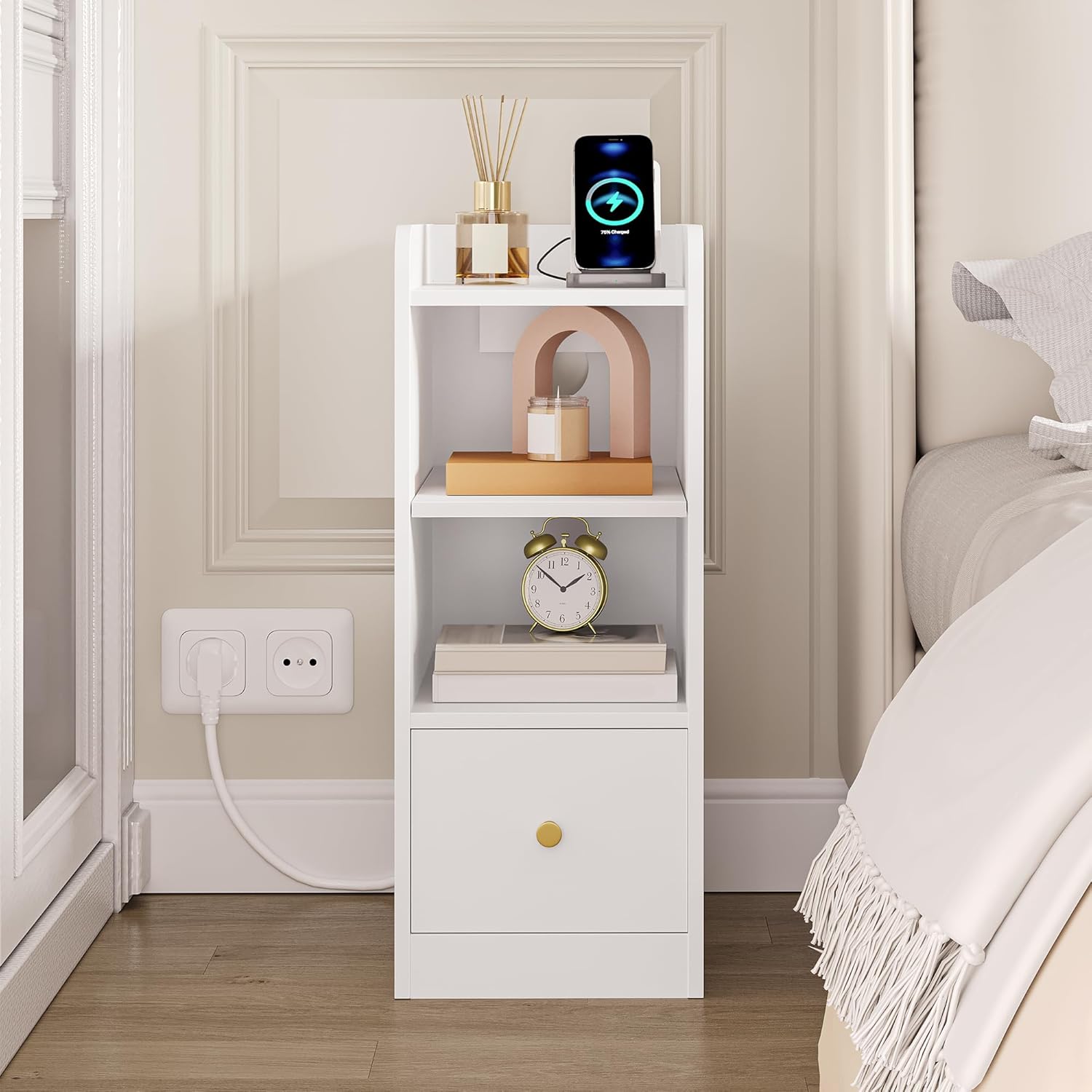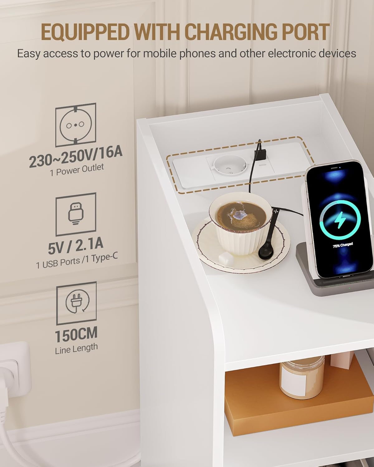【Avec Prise de Charge】Cette petite table de chevet a plus qu’une simple fonction de rangement, c’est le compagnon idéal pour votre téléphone portable, votre tablette et autres appareils électroniques ! Lorsque votre appareil est à court d’énergie, il suffit de connecter la table d’appoint pour le recharger. Elle prend également en charge les ports USB et de type C, de sorte que vous n’avez plus à vous soucier des problèmes liés à l’incompatibilité des prises!