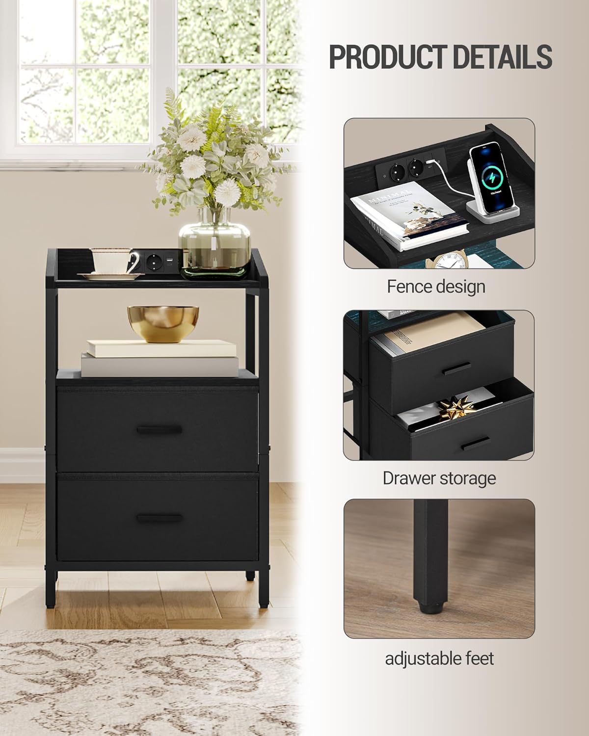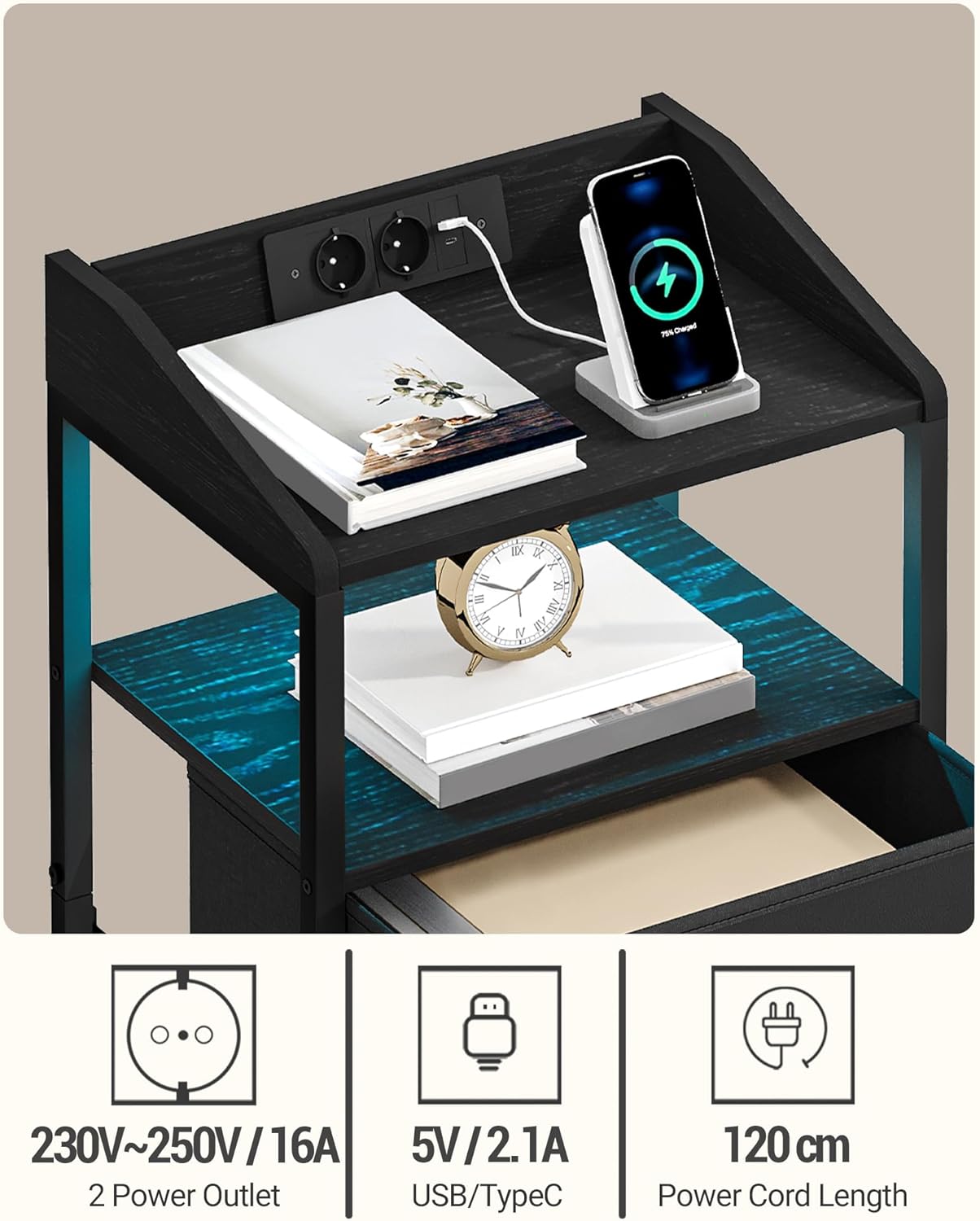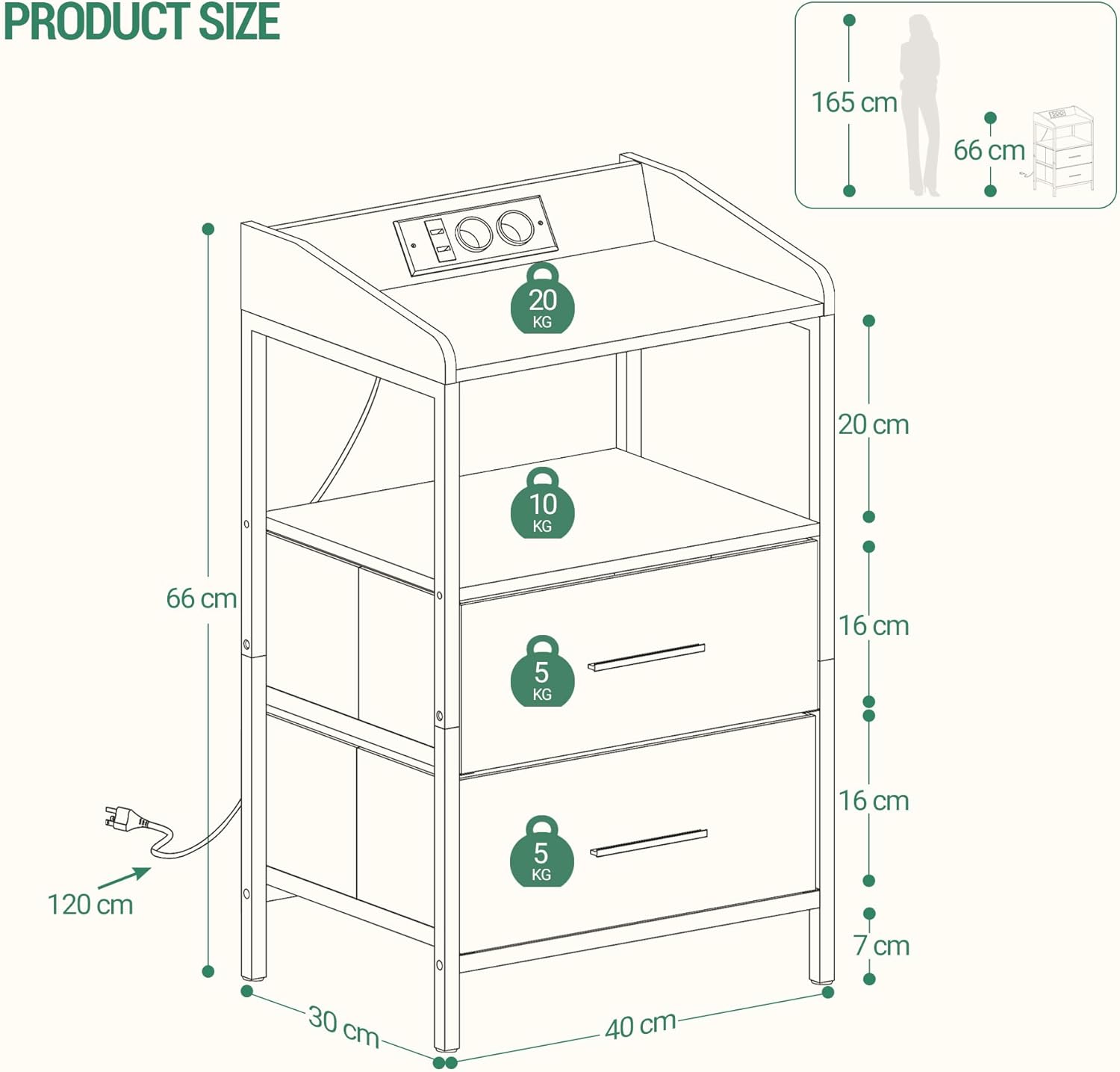 【Table de Nuit avec Station de Chargement】Notre table de chevet moderne est équipée d’un port USB, d’un port de type C et de deux prises de courant, ce qui constitue une solution de recharge pratique pour vos téléphones portables, iPads et autres appareils. Fini le temps où vous deviez chercher les prises disponibles ! Les prises bien placées permettent également d’organiser les câbles lorsque vous chargez plusieurs appareils.