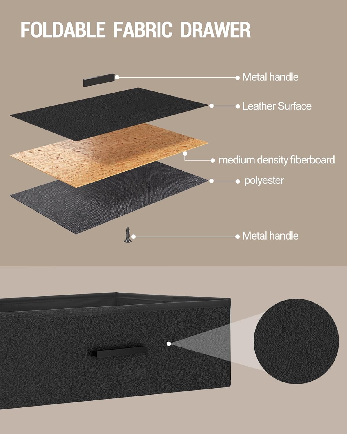 Avec 2 tiroirs spacieux en tissu, notre table de chevet offre un vaste espace de rangement pour tous vos effets personnels.