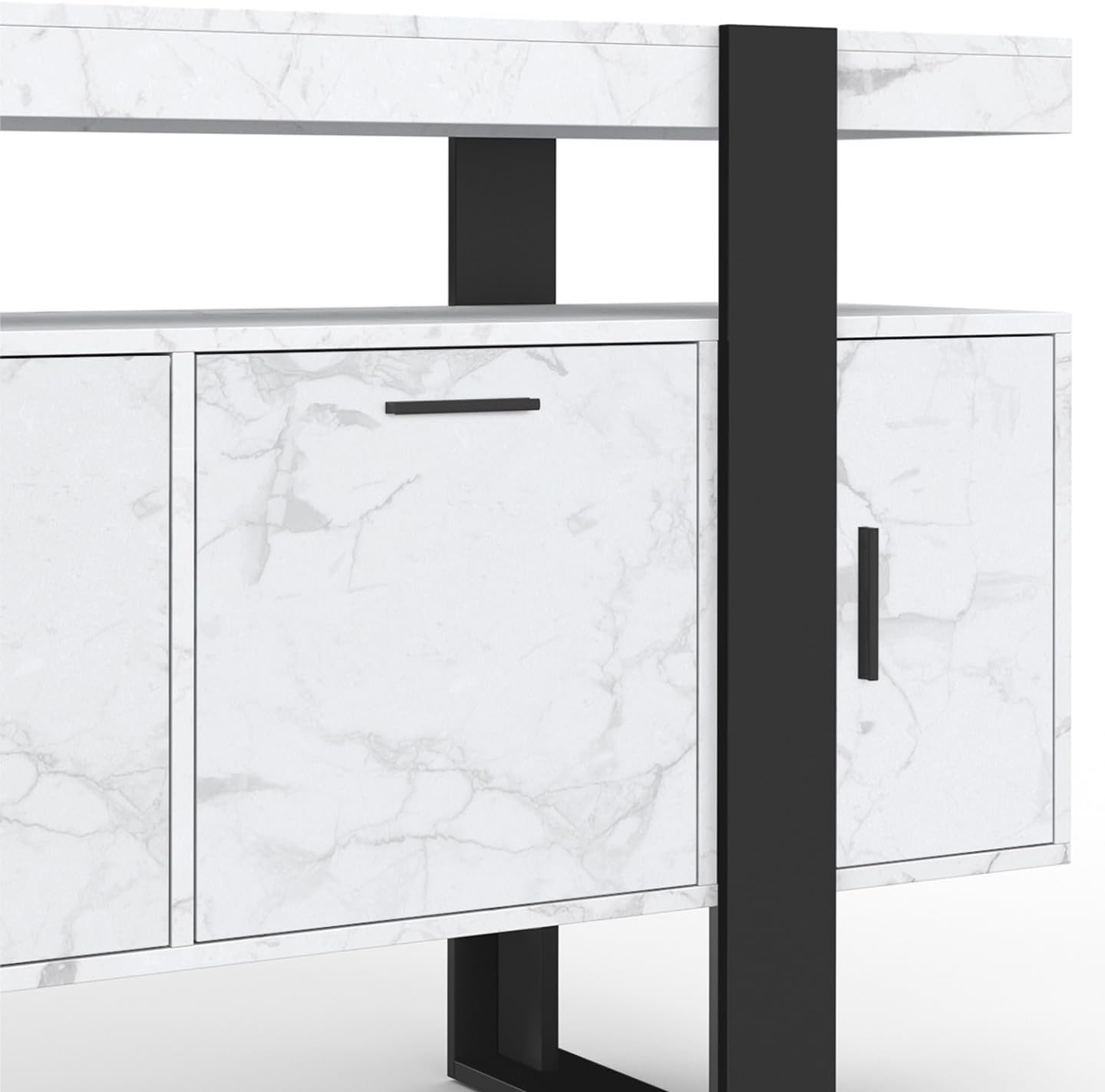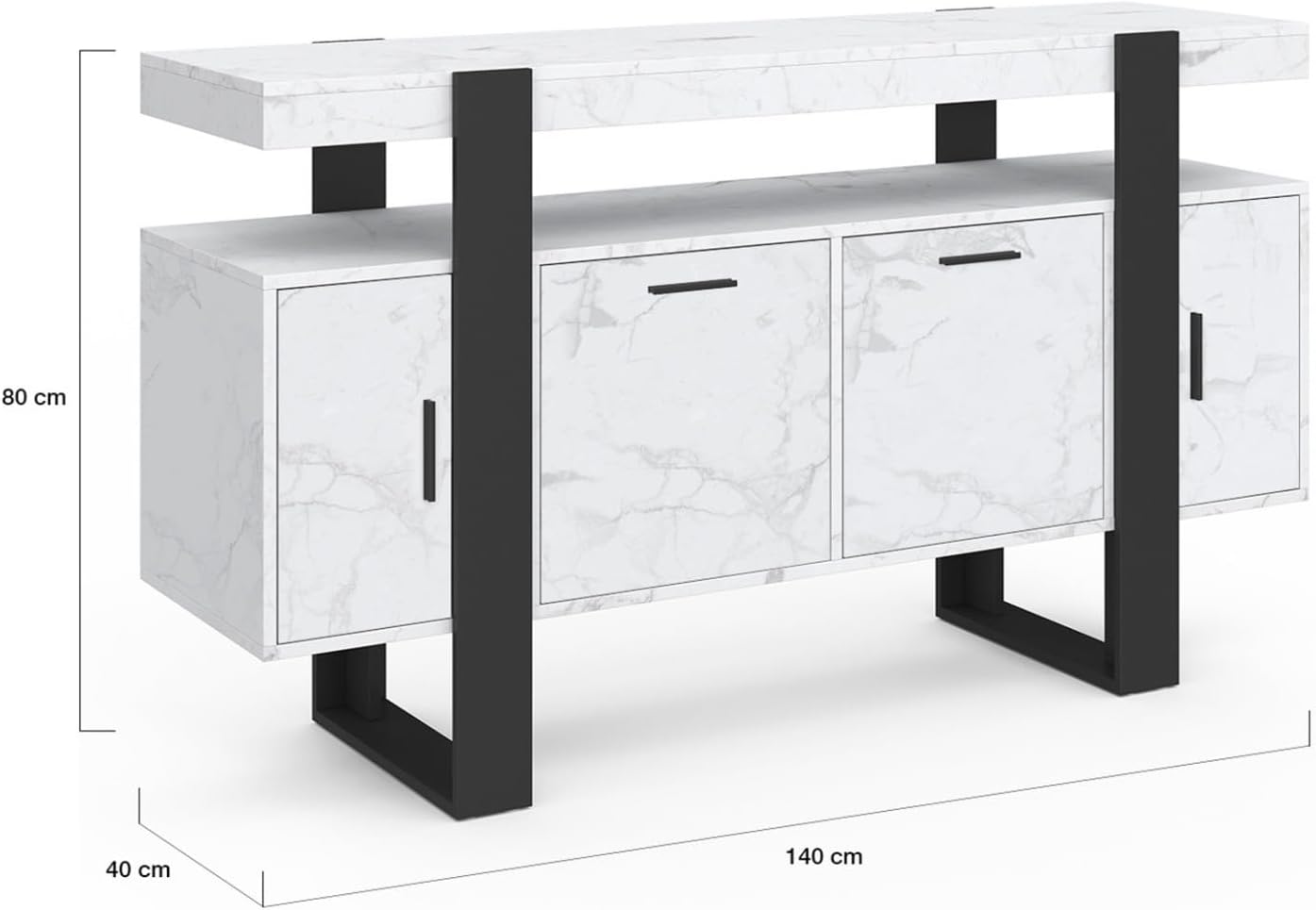 Vous recherchez un meuble à la fois tendance et pratique qui vous offre une maxi capacité de rangement ? Découvrez le buffet PHOENIX 140 cm 4 portes effet marbre blanc et noir qui donnera du cachet à votre salle à manger !Doté de nombreux espaces de rangement, ce buffet 140 cm aux dimensions généreuses est idéal pour une pièce de vie ordonnée. Ses 4 placards, dont deux munis d’une étagère, vous permettront de ranger vaisselle, électroménager, vases ou même livres de cuisine et autres effets personnels à l’abri des regards.Exposez objets déco, lampe ou encore petite plante verte sur son étagère supérieure !Ses pieds larges et sa structure à l’aspect massif assurent solidité et stabilité à ce buffet ultra design.L’association des coloris marbre blanc et noir apportera modernité et tendance dans votre intérieur. Ses coloris se fondront à merveille avec votre décoration pour une ambiance à la fois design et moderne !Profitez de ce buffet effet marbre blanc et noir à prix irrésistible !Dimensions du buffet PHOENIX 4 portesDimensions globales : Longueur 140 cm x largeur 40 cm x Hauteur 80 cmDimensions compartiments latéraux : L. 29 x l. 35 x H. 37 cmDimensions portes latérales : 19,5 x 36,5 cmDimensions placards centraux : L. 37 x l. 35 x H. 37 cm (avec étagères au milieu)Épaisseur totale du plateau supérieur : 7 cmHauteur entre le plateau supérieur et inférieur : 13 cmHauteur du sol : 20 cmLargeur des pieds : 9 cmMatériaux : panneaux de particules de bois (PB)Coloris : Effet marbre blanc et noirÀ monter soi-mêmeRetrouvez l’ensemble de nos buffets ainsi que notre collection PHOENIX sur notre boutique en ligne !