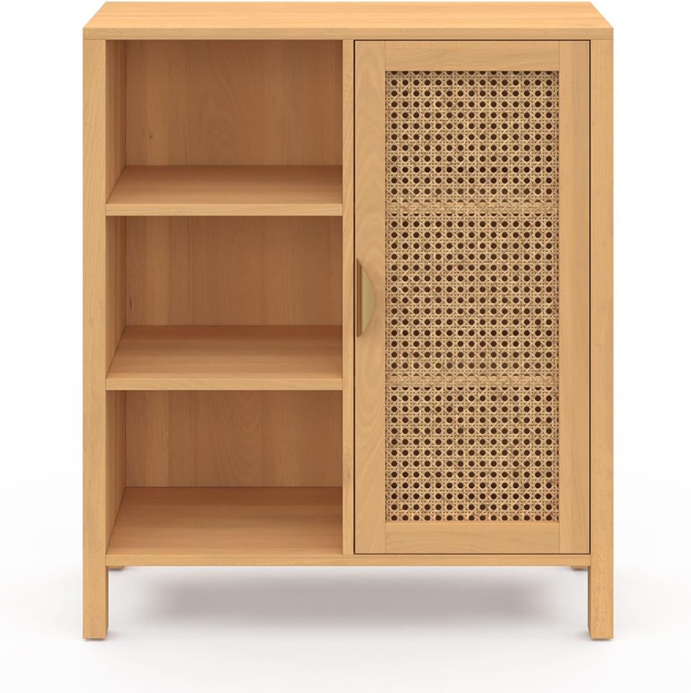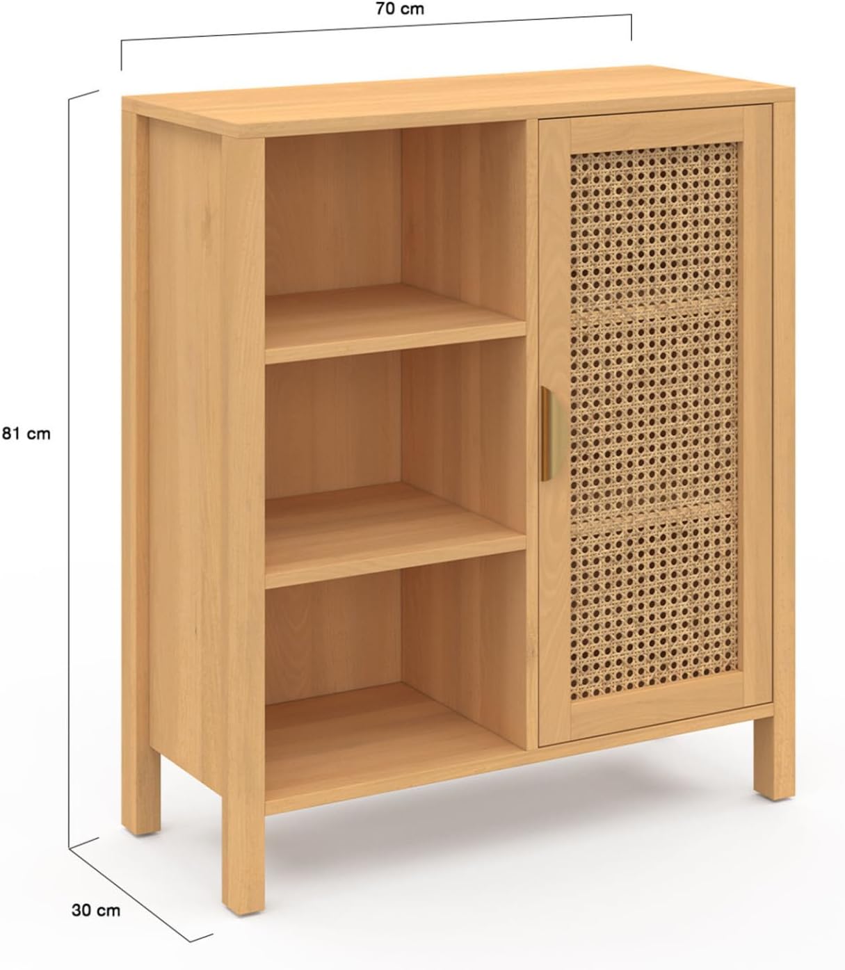 Découvrez le buffet d’appoint 3 étagères avec placard EDHEN et ses façades de portes en rotin naturel ! Doté de multiples rangements, il mettra en valeur vos accessoires tout en gardant votre pièce bien ordonnée !Design et fonctionnel, ce meuble de rangement s’adaptera facilement aux différentes pièces de votre maison quel que soit votre intérieur grâce à son coloris bois intemporel.Un placard muni de deux étagères vous offrira un espace de rangement fermé pour conserver vos affaires à l’abri de la poussière. Modulez les étagères selon vos besoins, en les réglant sur l’une des 3 positions possibles !Exposez vos plus beaux objets déco sur les trois étagères latérales ouvertes ! Vous pouvez également utiliser le dessus du meuble pour disposer vide-poche, lampe ou encore petite plante verte.Avec ses multiples rangements et ses dimensions compactes, utilisez ce meuble fonctionnel dans une cuisine, une entrée, un bureau ou même une chambre comme bibliothèque d’appoint !Sa structure en panneaux de particules de bois lui assure stabilité et robustesse en participant à son look élégant et épuré.Optez pour le design cannage malin avec ce buffet d’appoint EDHEN !Dimensions du meuble de rangement 3 étagères et placard EDHENDimensions globales : Longueur 70 cm x largeur 30 cm x Hauteur 81 cmDimensions du placard : L. 32 x l. 25,5 x H. 67,5 cmDimensions d’une étagère ouverte : L. 31,5 x l. 28 cmEspace entre chaque étagère : 21,5 cmHauteur des pieds : 10 cmMatériaux : panneaux de particules de bois (PB) et cannage naturelColoris : boisÀ monter soi-mêmeRetrouvez l’ensemble de notre collection cannage sur notre boutique en ligne !