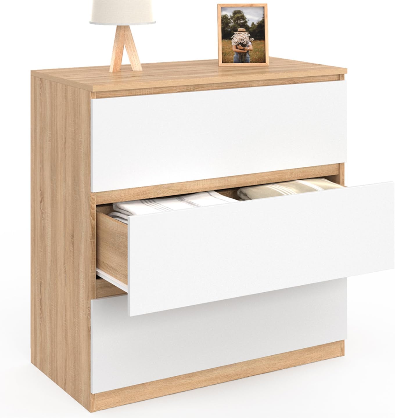 Meuble fonctionnel par excellence, la commode 3 tiroirs TOMI sera l’alliée parfaite du rangement de votre chambre à coucher ou de celle de vos enfants ! Avec son coloris bois et blanc chic et intemporel, elle s’intégrera à toutes les pièces, tout en apportant un côté pratique et design à votre intérieur.D’une hauteur idéale de 80 cm, la commode offre de grands tiroirs coulissants, facilement accessibles, sans avoir à se baisser. De hauteur suffisante pour les linges plus volumineux, ils disposent de larges poignées intégrées discrètes, pour une prise en main aisée. Les larges tiroirs peuvent accueillir tout type de linge, et le garder parfaitement rangé et organisé à l’abri de la poussière et de l’humidité. De tailles équivalentes, les 3 tiroirs, fonctionnels, offrent une maxi capacité de rangement. Multifonction, la commode TOMI trouvera sa place dans une chambre, comme dans un bureau en tant que meuble d’appoint pour le classement de vos dossiers personnels ou professionnels. De quoi protéger vos documents des regards indiscrets, tout en les gardant parfaitement rangés à portée de main pour les retrouver en un clin d’œil ! Profitez de son large plateau pour y poser un écran plat et passer de bonnes soirées télé confortablement installé dans votre lit.Stable et robuste, en panneaux de particules de bois, ce meuble 3 tiroirs à prix mini supportera petites plantes vertes, cadres et objets de décoration divers pour personnaliser votre pièce à votre goût !Son coloris bois et blanc apportera un design moderne et lumineux à votre intérieur.Avec son format compact, et une largeur de seulement 40 CM, le gabarit de la commode 3 tiroirs TOMI conviendra à tous les intérieurs !Dimensions de la commode 3 tiroirs TOMIDimensions totales hors tout : Longueur 77,5 cm x largeur 40 cm x Hauteur 80 cmDimensions d’un tiroir : H. 22,5 x Épaisseur 1,2 cmDimensions de l’intérieur d’un tiroir : L. 68,5 x l. 33,5 cmEspace entre les tiroirs : 2,5 cmMatériaux : particules de bois, épaisseur 12 mmÀ monter soi-mêmeDécouvrez nos différentes tailles et coloris de commodes TOMI sur notre boutique en ligne !