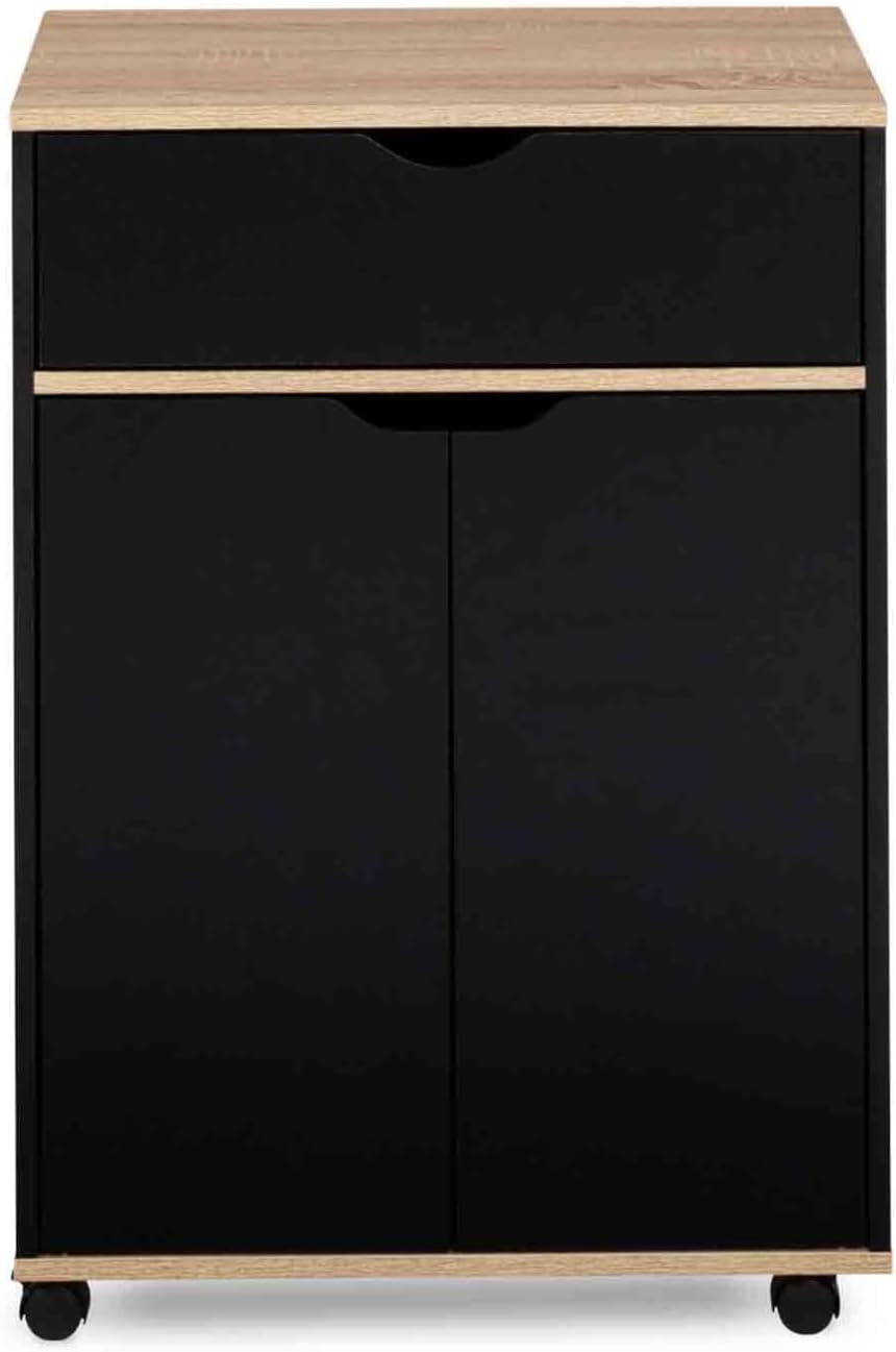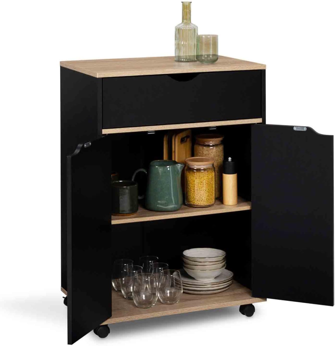 Vous avez besoin de plus de rangement dans votre cuisine ? Découvrez notre desserte de cuisine COSY avec tiroir bois noir et plateaux façon hêtre. Voilà le meuble parfait pour l’optimisation de votre espace ! Composée d’un large placard, empilez toute votre vaisselle, torchons, conserves ou produits d’entretien dans cet espace fermé, très pratique pour dissimuler votre petit bazar de cuisine. Ses multifonctions ne s’arrêtent pas là : au-dessus du placard, vous trouverez un tiroir, idéal pour y entreposer vos couverts et autres ustensiles de cuisine. Son large plateau sur le dessus, vous permettra de cuisiner ou continuer votre rangement ou d’y déposer votre micro-ondes. Dotée de 4 roulettes directionnelles, vous pouvez la déplacer très facilement, tout en gardant à portée de main vos condiments pendant que vous cuisinez.Grâce à son côté bicolore noir et bois, cette desserte apportera une touche de modernité à votre cuisine et se mariera parfaitement avec votre décoration intérieure.Besoin de gagner de l’espace dans votre cuisine ? Laissez-vous séduire par cette desserte roulante, ultra design et fonctionnelle, qui ravivera votre déco intérieure en un tour de main !Dimensions de la desserte COSY tiroir bois noir et plateaux façon hêtreDimensions globales : Longueur 60 cm x Profondeur 39.5 cm x Hauteur 85 cmDimensions intérieures du tiroir : L. 52 x P. 29 x H.14.3 cmDimensions intérieures du placard : L. 57 x P. 35 x H.59 cmÉtagère ajustable à l’intérieurPanneaux de particules de boisColoris : bois noir et plateaux façon hêtreÀ monter soi-même (visserie incluse)Retrouvez l’ensemble de nos meubles et éléments de cuisine sur notre boutique en ligne !