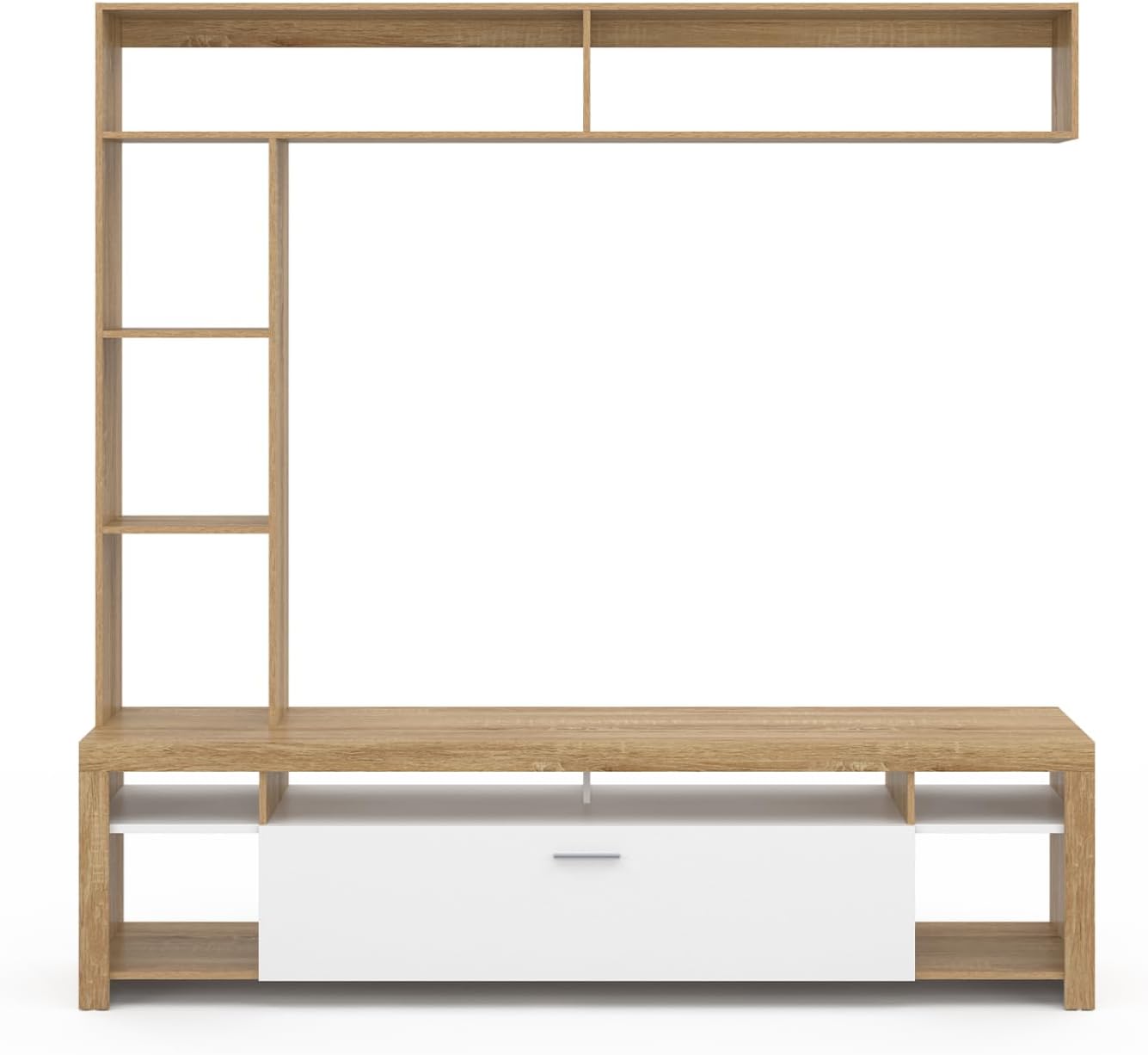 Laissez entrer le style contemporain dans votre intérieur avec l’ensemble meuble TV MALO 170 cm bois et placard blanc ! Il saura parfaitement s’intégrer dans les intérieurs urbains mais aussi plus authentiques.Avec son joli coloris bicolore bois et blanc, cet ensemble meuble TV avec étagères fera son effet devant vos invités, donnant un look moderne et élégant à votre salon !Elément de rangement et de décoration, esthétique et pratique, le meuble TV MALO, avec son plateau d’une longueur idéale de 140 cm, conviendra aux petits comme aux grands espaces.Le meuble MALO est muni d’un rangement fermé avec une poignée pratique et maniable pour ranger vos livres ou effets plus personnels en toute discrétion derrière sa jolie porte large, et de onze espaces ouverts pour vos télécommandes, lecteurs DVD ou blue-ray, box, livres et petits objets de décoration.Stable et robuste, ne craignez pas d’y poser votre TV et d’y ranger vos livres !Le meuble MALO promet de bonnes soirées télé en perspective en famille ou entre amis !Multifonction, meuble de rangement et meuble TV, il apportera sa touche contemporaine à votre intérieur !Dimensions de l’ensemble meuble TV bois et placard blancDimensions globales : Longueur 170 cm x largeur 40 cm x hauteur 170 cmDimensions étagère verticale : L.31.5 x l.23 x H.104 cmDimensions du placard : L.110 x l.40 x H.26 cmDimensions des niches latérales supérieures : L.25 cm x l.40 x H.9 cmDimensions des niches latérales inférieures : L.25 x l.40 x H.23 cmDimension de la niche supérieure : L.107.5 x l.38.5 x H.9 cmMatériaux : Panneau de particules de bois (PB)À monter soi-mêmeRetrouvez l’ensemble de notre collection contemporaine sur notre boutique en ligne.Egalement disponible en format 110 cm bois et blanc et bois et noir.
