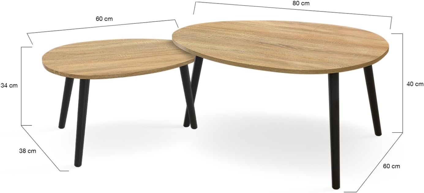 Apportez une note contemporaine à votre séjour grâce à ce lot de 2 tables basses gigognes bois et noir et leur design, d’inspiration nordique à la fois ultra-tendance, simple et sophistiqué.À la fois pratiques et jolies, libre à vous d’agencer ces tables basses gigognes de la manière dont vous le souhaitez pour créer l’intérieur qui vous ressemble. Elément déco ou tables de rangement pour vos magazines, télécommandes ou petites plantes d’intérieur, chacune aura son utilité ! Idéales pour vos soirées télé ou apéritifs entre amis, vous pourrez également les placer facilement les unes sous les autres pour un rangement optimal permettant de gagner de l’espace !Véritables éléments de décoration, les tables basses gigognes apporteront un certain cachet à votre intérieur. Grâce à leur forme ovale et à leurs pieds en bois solides, ces tables de salon donneront un côté chaleureux à votre pièce de vie.Que votre espace salon soit plus petit ou très spacieux, ces deux tables basses GAIA y trouveront forcément leur place. À utiliser seules ou bien par 2, créez une atmosphère cocooning à petit prix grâce à ce lot au style scandinave !Dimensions des 2 tables basses gigognes GAIA bois et noirDimensions de la grande table basse : Longueur 80 cm x largeur 60 cm x Hauteur 40 cmDimensions de la petite table basse: L. 60 x l. 38 x H. 34 cmMatériaux : MDF et pieds en boisColoris : Bois et noirÀ monter soi-mêmeRetrouvez l’ensemble de notre collection scandinave sur notre boutique en ligne.