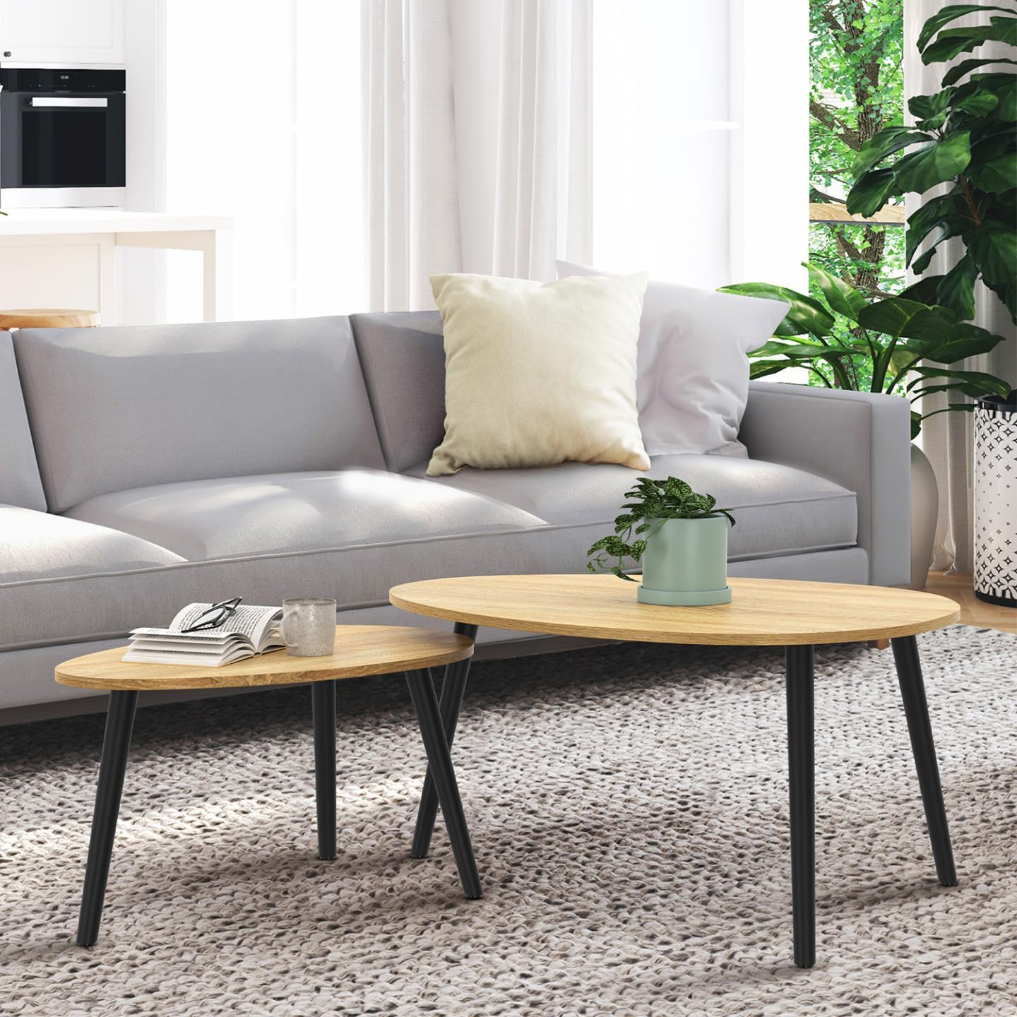 Adoptez ce lot de 2 tables basses gigognes ovales plateau coloris bois et pieds noirs !