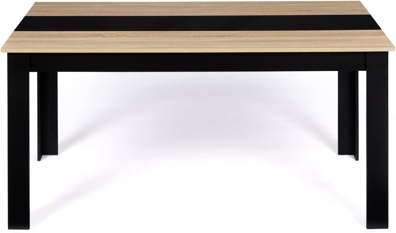 Vous êtes à la recherche d’une table à la fois tendance et pratique ? Découvrez la table à manger GEORGIA avec son plateau de 160 cm pouvant accueillir jusqu’à 8 personnes !Solide, cette table en particules de bois (1,5 cm) au plateau bicolore apportera une touche chaleureuse et contemporaine à votre intérieur et se mariera à merveille avec votre mobilier !Son plateau hêtre est composé de 2 coloris pour un aspect encore plus tendance ! Le détail en plus de cette table, c’est la ligne centrale en MDF noire avec finition brillante pour apporter une touche de lumière. Ses dimensions compactes 160 x 75 cm vous permettront de recevoir confortablement jusqu’à 8 invités sans pour autant occuper trop de place dans votre salle à manger !Stable et robuste, la table est surélevée de 4 pieds en bois 10 x 10 cm qui lui assurent une bonne stabilité.Craquez pour cette table à manger bicolore qui réchauffera l’ambiance de votre salle à manger.Dimensions de la table à manger 8 personnes noire et imitation hêtreDimensions totales : Longueur 160 cm x largeur 90 cm x Hauteur 75 cmDimensions des pieds : L. 10 x l.10 x H. 73,5 cmEspace entre les pieds sur la largeur : 66,5 cmDimensions plaque centrale : L. 160 x l. 30 cmMatériaux : structure panneaux de particules de bois (PB), bande centrale en MDFÉpaisseur de la structure en PB : 1,5 cm4 pieds en bois8 patins de protection au piétement fournisÀ monter soi-mêmeRetrouvez tous nos coloris contemporains sur notre boutique en ligne :- Table à manger GEORGIA 8 personnes façon hêtre et noire 160 cm- Table à manger GEORGIA 8 personnes blanche et grise 160 cm- Table à manger GEORGIA 8 personnes blanche et noire 160 cm- Table à manger GEORGIA 8 personnes imitation hêtre et blanche 160 cm- Table à manger GEORGIA 8 personnes blanche et imitation hêtre 160 cm