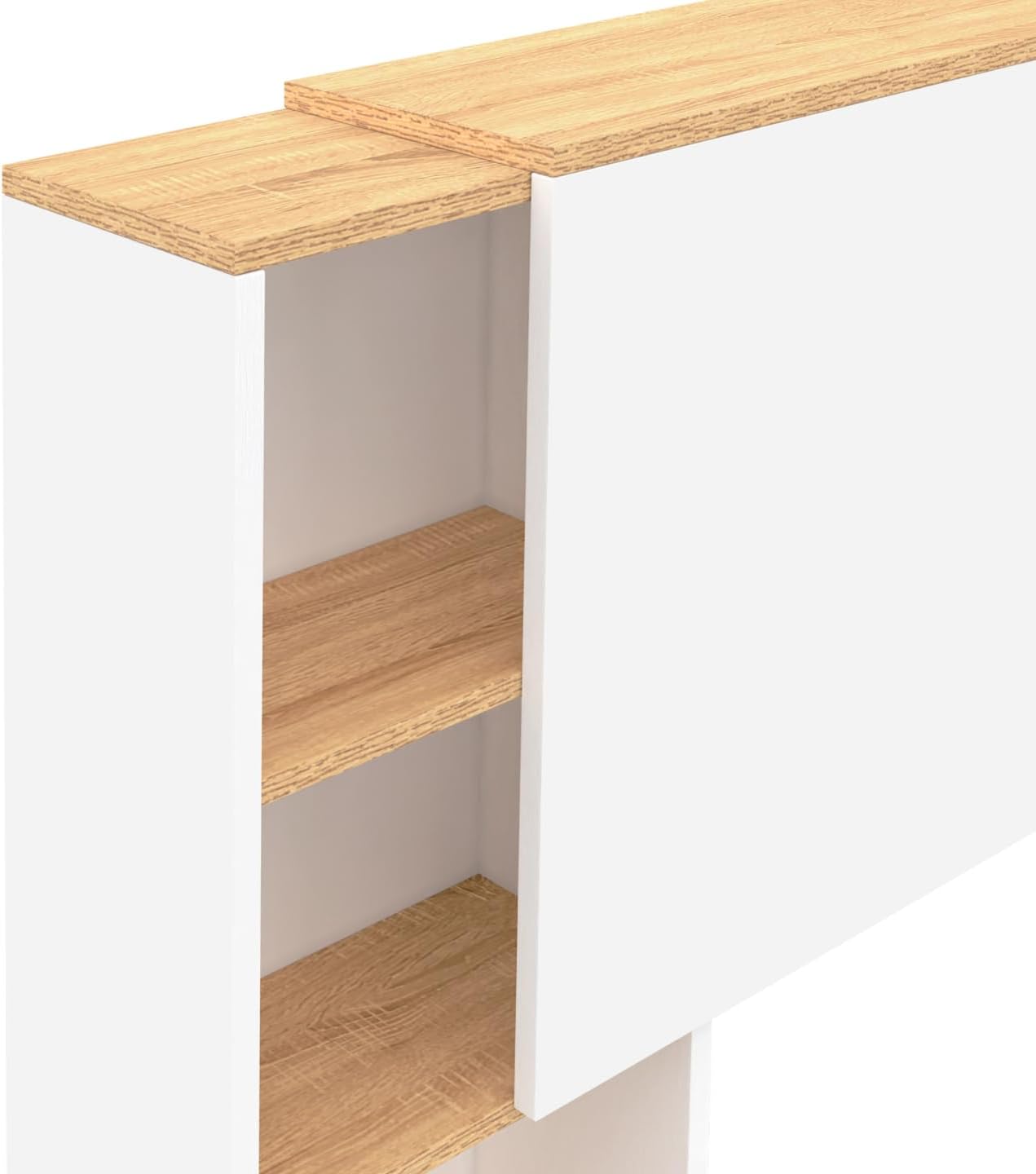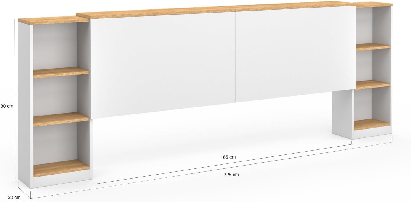 La tête de lit est composée de deux caissons coulissants de 30 cm ainsi que d’un panneau central fixe de 165 cm.Chacun des chevets peut coulisser à l’intérieur de la partie centrale. La tête de lit peut donc s’étendre de 165 à 225 cm en modulant les caissons selon vos envies.Grâce au système de chevets coulissants, plus besoin de choisir des chevets à harmoniser avec votre lit et votre tête de lit !Vous pouvez laisser les chevets ouverts en permanence, ou, choisir de les ouvrir et fermer en fonction de vos besoins. Pratiques et astucieuses, ses deux colonnes permettent de stocker et d’organiser votre espace de nuit. Adaptez la tête de lit CATBA sur un lit de 140 ou de 160 cm pour un rendu esthétique et ordonné et jouez avec les caissons pour créer le rendu de votre choix. L’espace central de 165 cm de longueur est recouvert par une planche en bois, parfaite pour entreposer quelques photos. Pratique et esthétique, choisissez la tête de lit élégante et pratique qui apportera du rangement dans votre chambre ! Dimensions de la tête de lit CATBA blanche et boisDimensions globales : Longueur 165/225 cm x largeur 20 cm x Hauteur 80 cmDimensions d’un chevet : L. 30 x l. 20 x H. 80 cmDimensions de la partie centrale fixe : L. 165 x H. 50 cmDimensions intérieure des étagères : L. 26,5 x l. 16 x H.2 2,5 cmHauteur des pieds : 6 cmMatériaux : panneaux de particules de bois (PB)Coloris : blanc et boisÀ monter soi-mêmeCe modèle de tête de lit est disponible dans un autre coloris : – Tête de lit extensible avec chevets coulissants CATBA façon bois et noirRetrouvez l’ensemble de nos têtes de lit sur notre boutique en ligne !