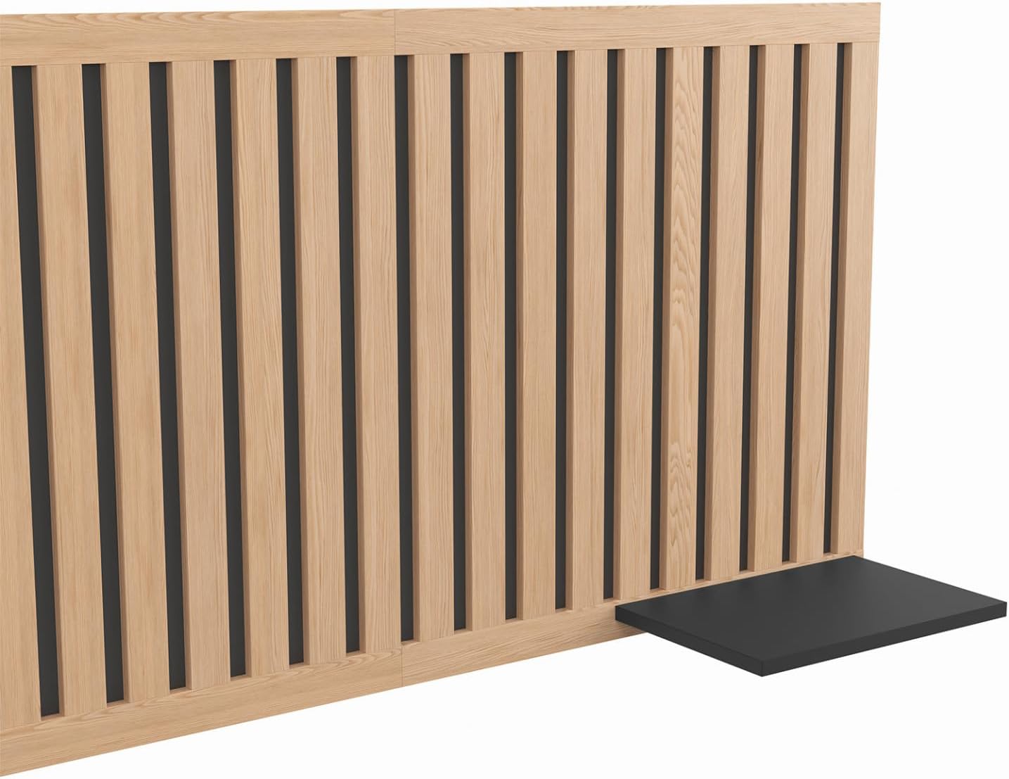 Craquez pour le look moderne de la tête de lit ARIA au design bicolore bois et noir. Conçue en tasseaux effet bois, cette tête de lit de 240 cm de long habillera votre mur et apportera une touche cossue et design à votre lit.Adaptable à tous les lits 140 cm et 160 cm, la tête de lit ARIA est facile à installer. Grâce à son design fin et ses accroches murales, elle permet également un gain de place dans votre chambre à coucher.La tête de lit ARIA est également composée de 2 tablettes de chevet noires, vous pourrez ainsi y déposer vos affaires personnelles, nécessaires de nuit, réveil ou encore lampes de chevet.Sa hauteur de 62 cm vous permet de vous adosser confortablement avec vos oreillers pour lire ou regarder votre série préférée. Dimensions de la tête de lit lattes ARIA bois et étagères noiresDimensions globales : Longueur 240 cm x largeur 23,5 cm x Hauteur 62 cmDimensions d’une étagère : L.32,5 x l.21,5 cmLattes de 3.8 cm de largeEspace entre chaque latte : 2 cmRebord de la tête de lit : 4 cm Matériaux : PBColoris : Bois et étagères noiresKit de fixation inclusÀ monter soi-mêmeRetrouvez également nos autres têtes de lit modernes disponibles sur notre boutique en ligne.