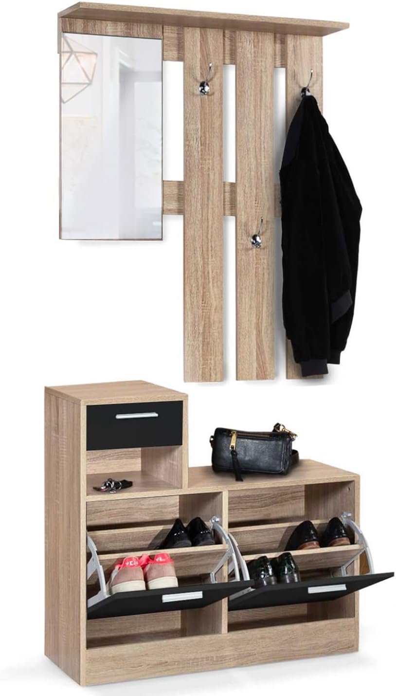 Apportez une touche moderne à votre intérieur en optant pour ce vestiaire d’entrée avec miroir et paroi murale en lattes aux coloris façon hêtre portes noires. Ce meuble s’adaptera parfaitement à votre décoration grâce à son design fonctionnel, chic et tendance ! L’association des deux couleurs procure à ce vestiaire un design très contemporain. La partie supérieure est composée d’un miroir et de 3 patères en inox pour suspendre vos vestes et manteau. Doté d’un miroir et de 3 patères double crochet en quinconce, ce meuble 2 en 1, meuble à chaussures et portant, arbore un style soigné tout en restant fonctionnel au quotidien.Avec son meuble bas composé de 2 abattants, d’1 niche et d’1 tiroir, ce vestiaire comporte tous les éléments indispensables pour organiser votre intérieur ! Grâce à son mécanisme à ouverture facile, vous pourrez ranger jusqu’à 8 paires de chaussures soit 16 chaussures. Sa niche d’une hauteur de 13 cm vous permettra de déposer vos clefs, un vide poche ou tout autre objet. Son tiroir d’une hauteur de 11,5 cm sera idéal pour ranger vos papiers et documents en toute discrétion. Maxi gain de place, il apporte une valeur ajoutée à votre vestibule en le décorant et en le meublant sans le surcharger.2 éléments aux formes asymétriques à combiner ou à dissocier selon vos envies ! Optez pour ce vestiaire d’entrée avec miroir multifonction et embellissez votre entrée !Dimensions du vestiaire d’entrée avec miroir design hêtre portes noires- Dimensions totales : Longueur 80 CM x largeur 30 CM x Hauteur 180 CM- Dimensions du meuble à chaussures : L. 80 x l. 30 x H. 73 CM- Dimensions des deux range-chaussures : L. 37 x l. 30 x H. 37 CM- Dimensions de la niche : L. 37 x l. 30 x H. 13 CM- Dimensions du tiroir : L. 37 x l. 30 x H. 11,5 CM- Dimensions de la partie supérieure du portant : L. 80 x l. 20 x H. 100 CM- Dimensions du miroir : L. 30 x H. 56 CM- Matériaux : panneaux de particules en bois 1,5 CM et miroir en verre