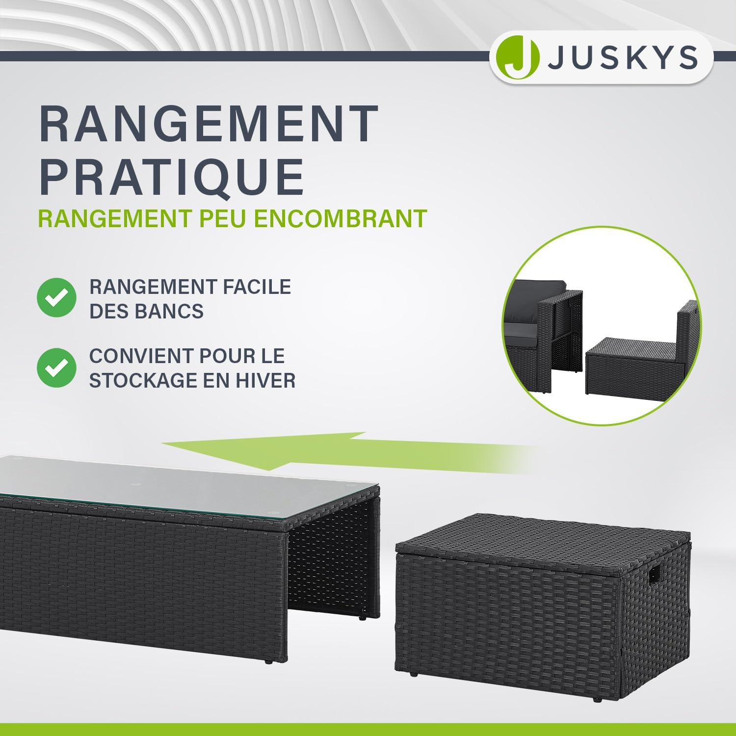 Marque : Juskys Numéro de modèle : Référence produit : 300861 Matériau et matériau Meubles : polyrotin, acier (revêtement par pulvérisation), plateau de table : Verre trempé – Revêtement : Tissu 100 % polyester 180 g/m² Couleur : noir Meubles : Noir – Rembourrage : Gris et gris Charge maximale : Charge maximale : Banc : 320 kg, fauteuil/tabouret : 160 kg chacun, table : 75 kg Dimensions (approximatives) : Banc (l x H x P) : 136 x 63 x 68 cm, fauteuil (l x H x P) : 59 x 60 x 67 cm – Table (l x H x P) : 103 x 33 x 50 cm – Tabouret (l x H x P) : 50 x 29 x 43 cm – Épaisseur du coussin de dossier : 15 cm – Épaisseur du coussin de siège : environ 7 cm Contenu de l’emballage 1 banc, 2 fauteuils, 1 table avec plateau en verre, 2 tabourets, 6 coussins de siège, 4 coussins de dossier, 1 manuel d’utilisation (français non garanti). Le produit est bien emballé en kit à monter soi-même par service de colis.