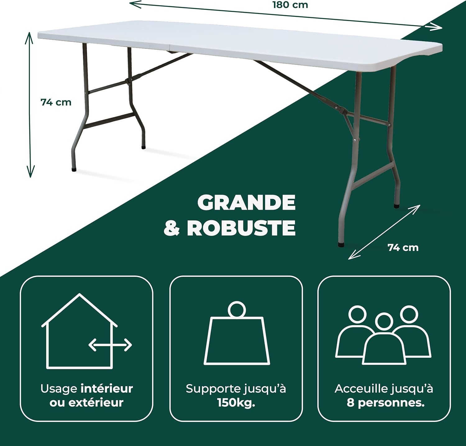 En résumé : Table pliante de Haute Qualité Garantie 2 ans – Dimensions ouverte : 180 x 74 x 74 cm – Dimensions pliée : 90 x 74 x 7 cm – Épaisseur du plateau : 3,3 cm – Loquet et 2 anneaux de sécurité – Poids max. supporté 150 Kgs – Pour toutes occasions, utilisation intérieure comme extérieur – Manipulation rapide et facile.