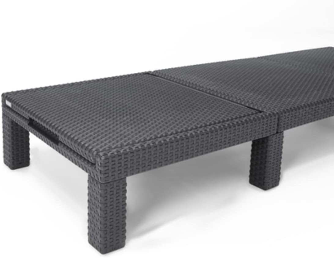 Chaise longue Daytona Deluxe – Aspect rotin naturel et ouvert, avec coussins confortables – Couleur : graphite, coussin gris – Tête de lit réglable en 4 positions – Dimensions (l x p x h) : environ 195 x 65 x 22 cm – Fabriqué en polypropylène (plastique) de qualité supérieure résistant aux UV et aux intempéries – Montage facile