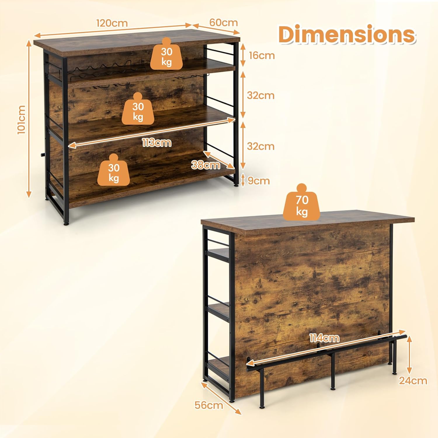Plongez dans le charme vintage de cette table de bar industrielle au design moderne et fonctionnel. Ses 3 étagères ouvertes, son porte-bouteilles pour 5 bouteilles et ses porte-gobelets garantissent un rangement organisé, tandis que le repose-pieds en métal offre un confort supplémentaire. La construction robuste et la finition marron mat avec des détails en bois en font une pièce élégante et polyvalente qui s’adapte à n’importe quel espace. Facile à assembler et avec une garantie de satisfaction, cette table de bar est parfaite pour les réunions entre amis ou pour ajouter une touche de style à votre maison ou votre entreprise. Ne manquez pas l’occasion de profiter de ce meuble unique et fonctionnel !