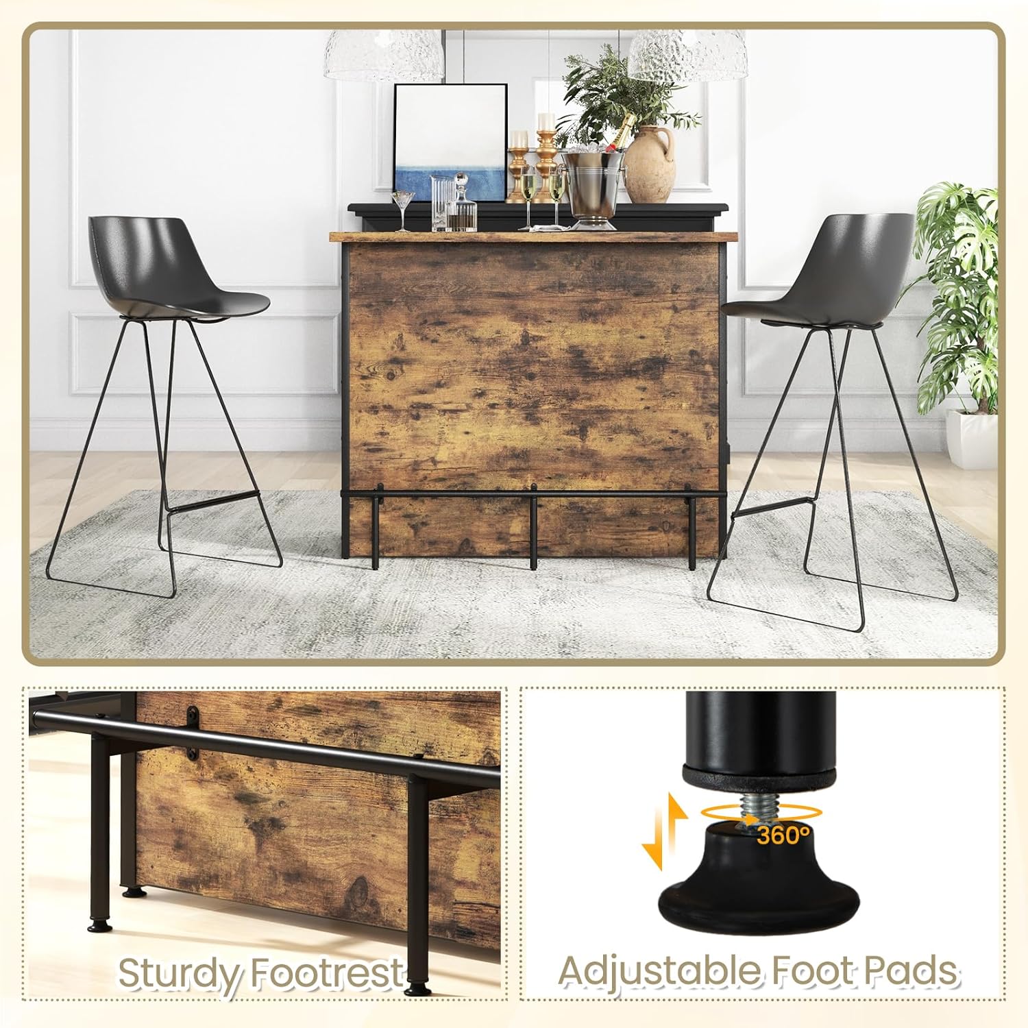REPOSE-PIED PRATIQUES : La table à vin de salle à manger dispose d’un repose-pieds en métal de 114 x 24 cm à la base de la partie arrière, sur lequel vous pouvez placer vos pieds pour un repos relaxant plus confortable, avec coussinets réglables pour plus de stabilité.