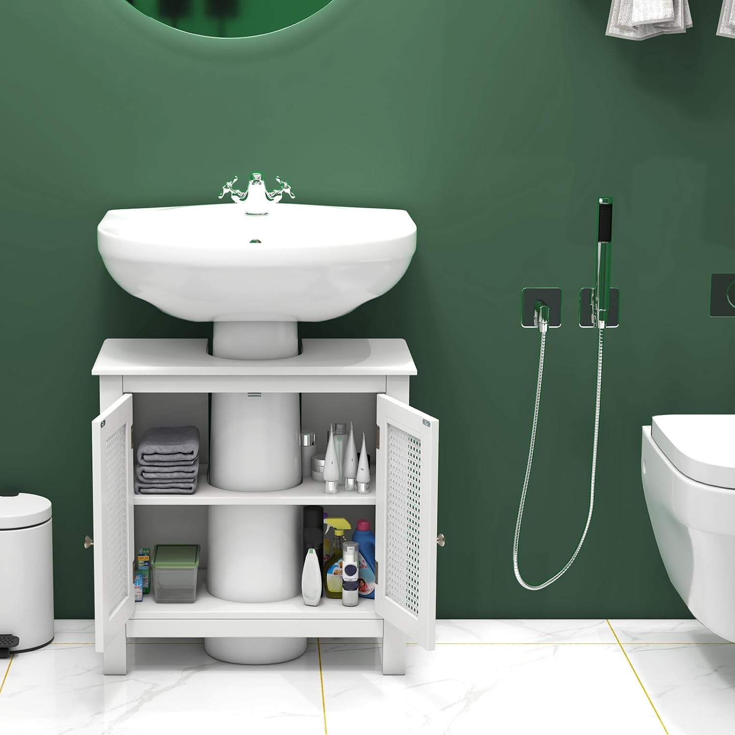 Donnez un nouveau look à votre salle de bains avec ce meuble lavabo pratique et élégant. Fabriqué à partir de panneaux MDF de haute qualité, il se compose de 2 niveaux et d’une partie supérieure spacieuse qui offre un vaste espace de rangement pour garder votre salle de bains bien rangée. Son trou en forme de U assure une compatibilité parfaite avec la tuyauterie du lavabo, tandis que les portes du meuble en rotin PE allient esthétique et fonctionnalité en favorisant la ventilation, et la surface est facile à nettoyer.
