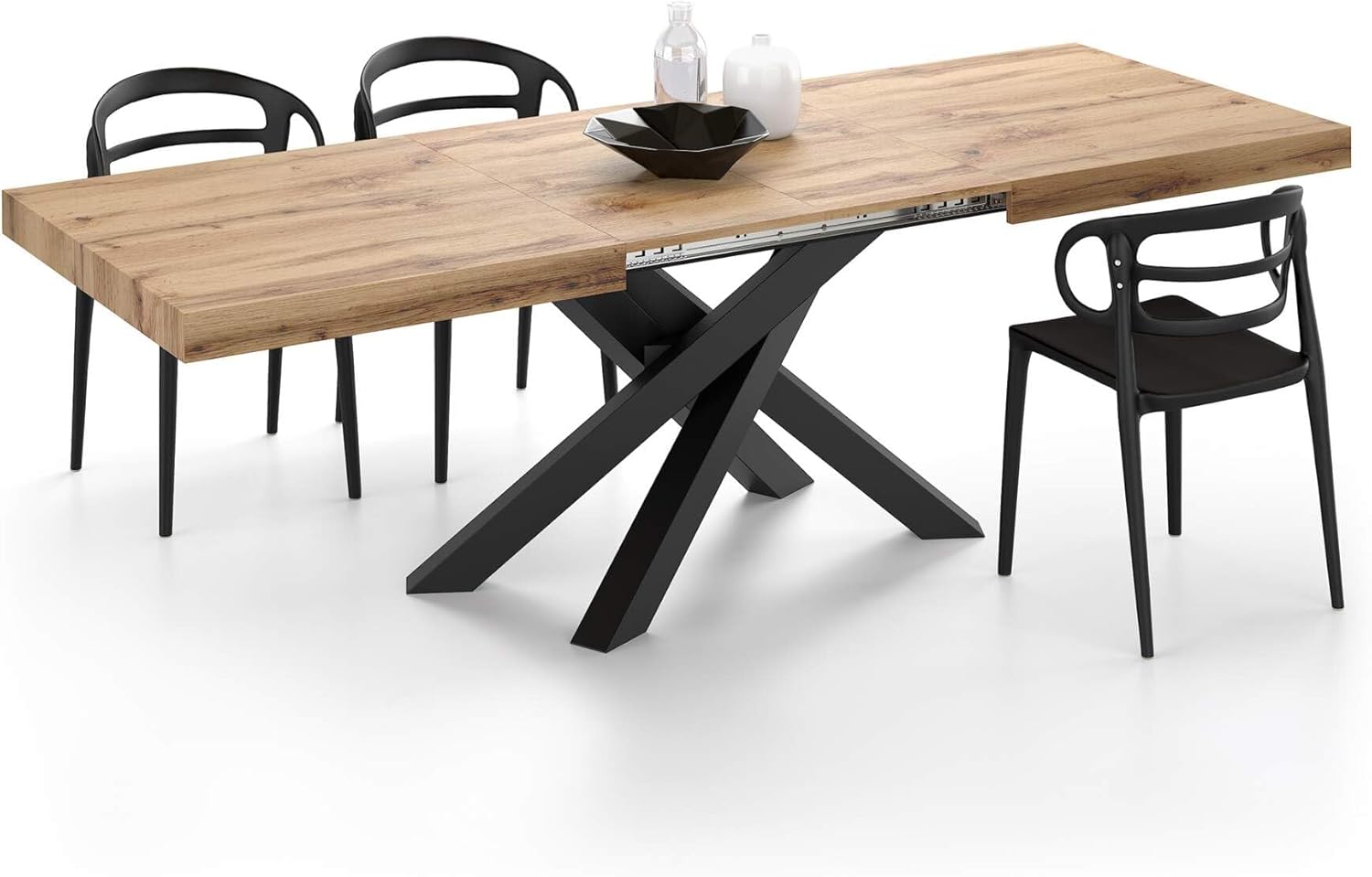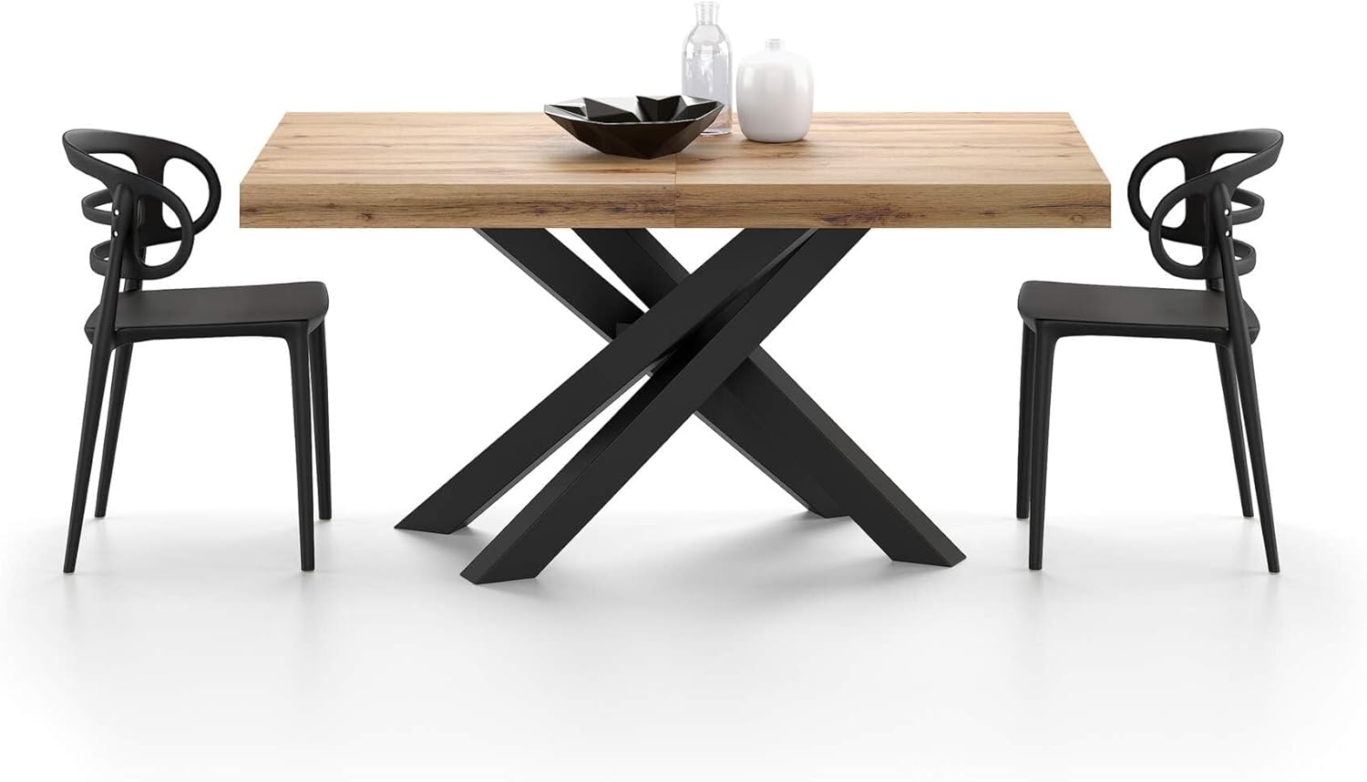Matériaux : le plateau de table et les rallonges de la table Emma Chêne Rustique sont fabriqués en panneaux de particules de haute qualité, durables et faciles à nettoyer. La continuité de la finition n’est pas garantie au niveau et entre le niveau et les extensions. L’ouverture de la table Emma est facile, une seule personne suffit : le mécanisme est synchronisé et en métal galvanisé. Les pieds croisés sont en fer revêtu par pulvérisation. La table extensible Emma est conçue pour une utilisation en intérieur uniquement.