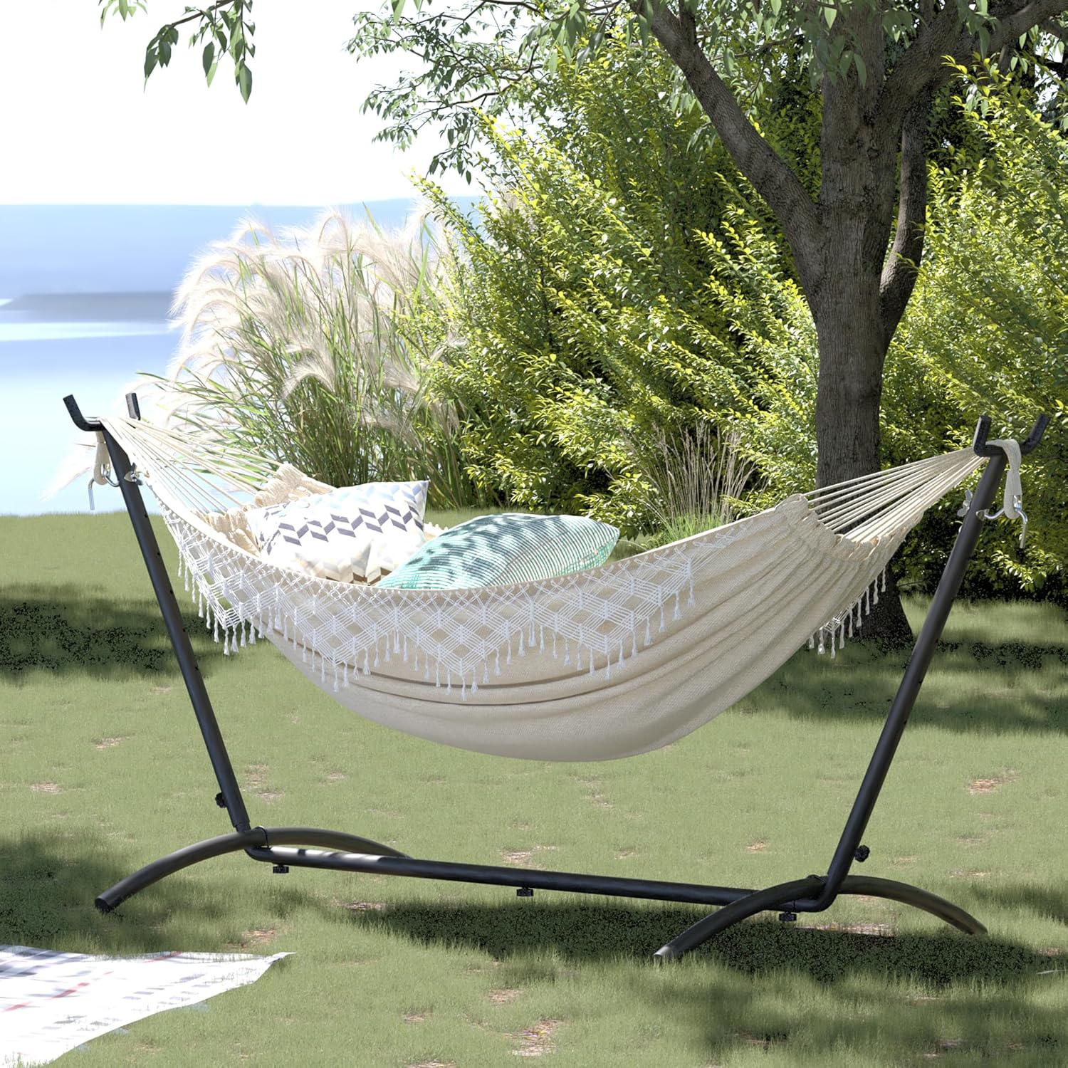 Stable et Durable : Le hamac est doté de sangles nouées spéciales pour plus de durabilité et de résistance, ainsi que de pieds antidérapants pour maintenir le hamac dans une position très stable.