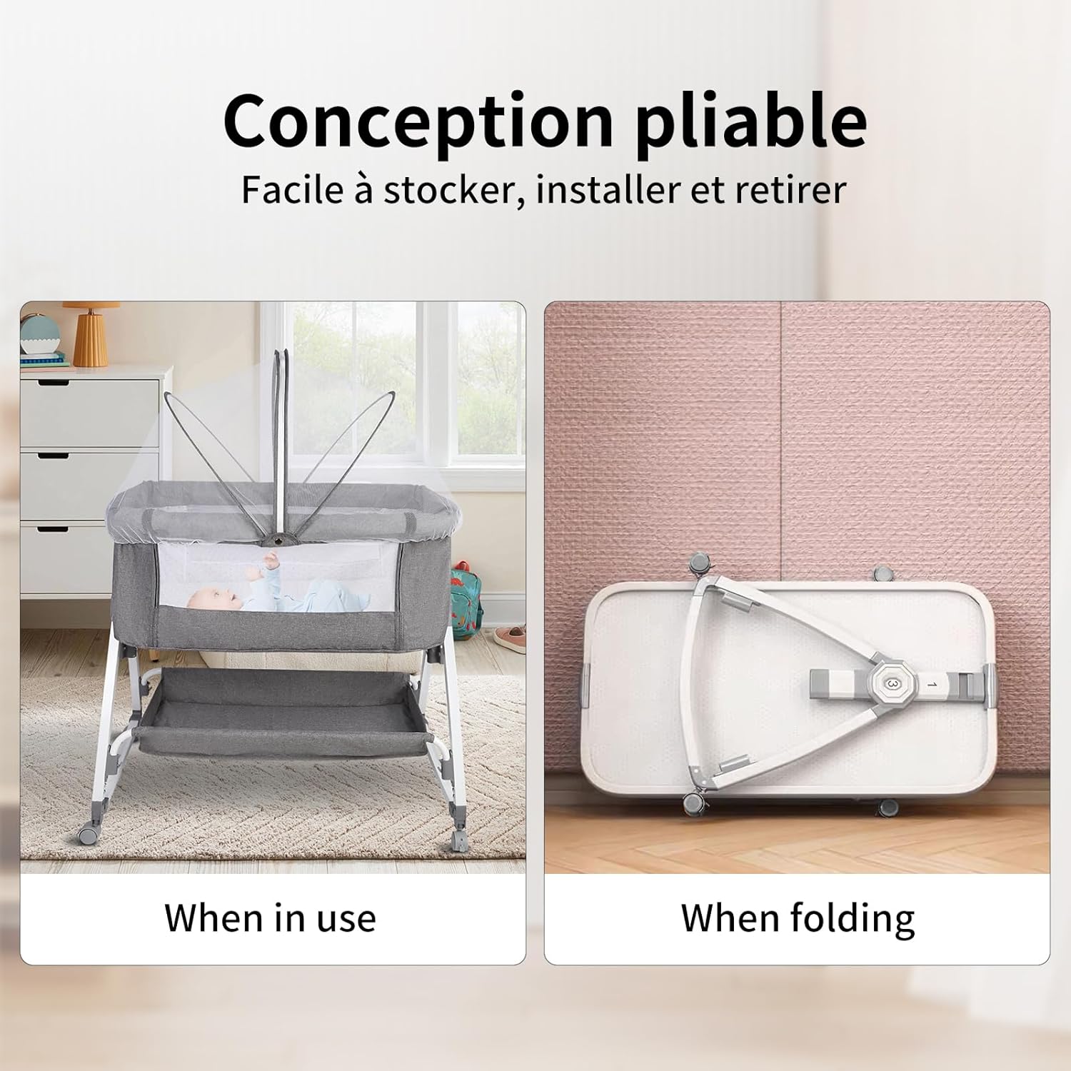 1, lit d’appoint pour bébé: avec le lit 2 en 1, vous et votre bébé pouvez dormir confortablement côte à côte, ou vous pouvez plier la partie latérale pour dormir séparément 2, tissu Maillé tout autour: Vous pouvez toujours voir le bébé, assurer la respirabilité et la circulation de l’air du lit