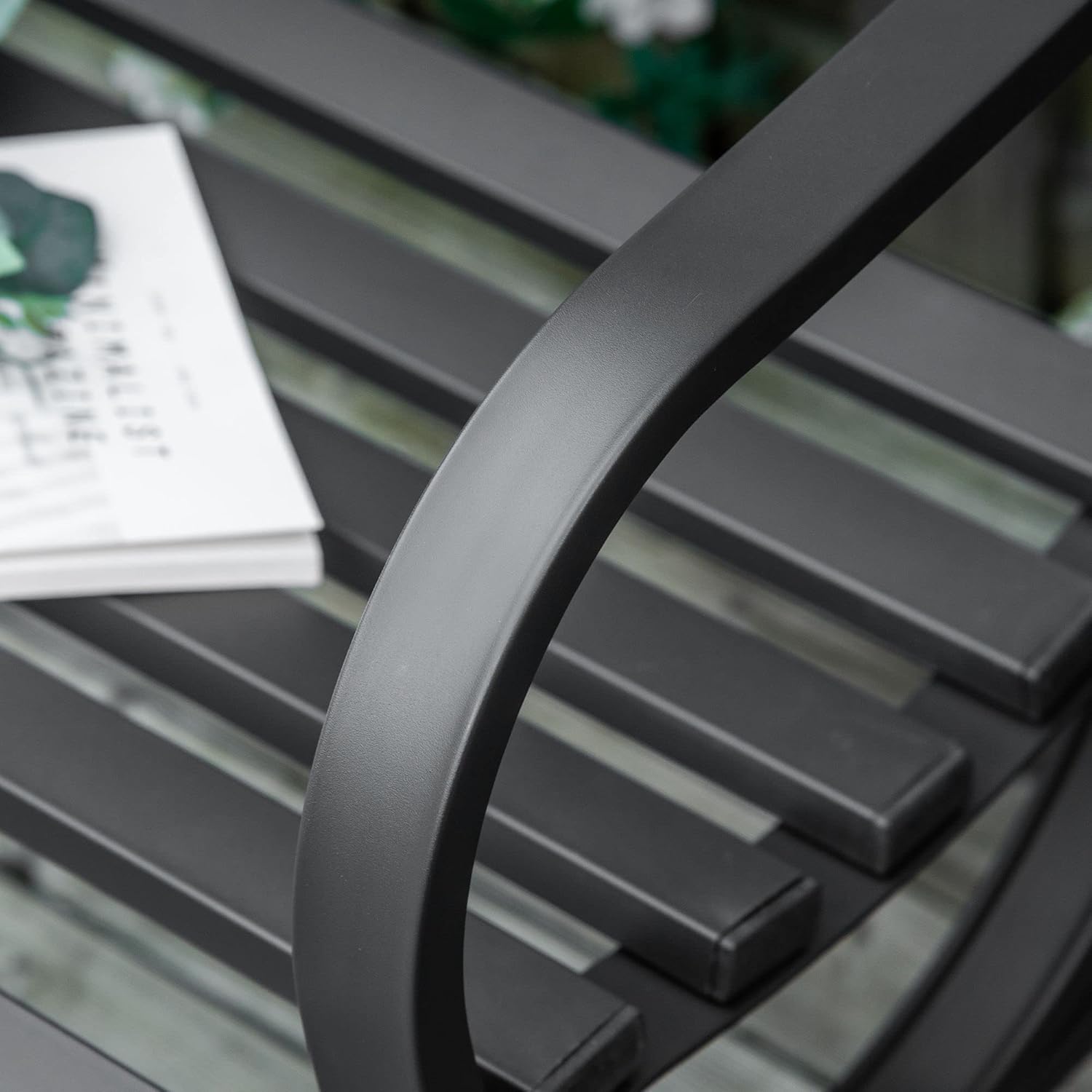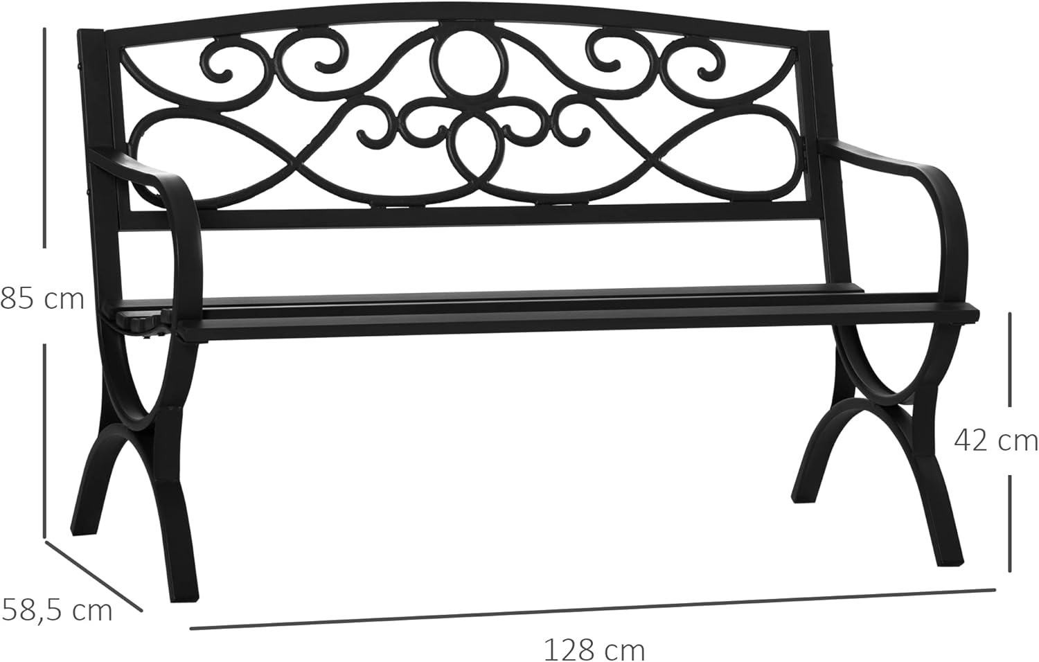 Banc de jardin 2 places style néo-rétro fer forgé avec de très belles lignes harmonieuses Idéal pour installation dans votre jardin, véranda ou sur votre terrasse Capacité de 2 à 3 personnes maximum, charge max. recommandée : 280 Kg Banc de qualité vous assurant une utilisation pérenne Haut dossier légèrement incliné et assise profonde à lattes pour plus de confort Accoudoirs aux lignes arrondies, piètement arqué : touche de raffinement supplémentaire Patins antidérapants : stabilité optimale, aucun risque de rayure de votre sol Montage rapide et facile à l’aide du manuel d’assemblage illustré fourni