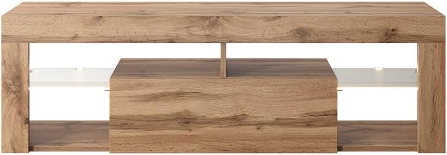 Cette armoire de télévision dispose de quatre étagères avec des plateaux en verre ainsi qu’un compartiment avec des portes à façade lisse.