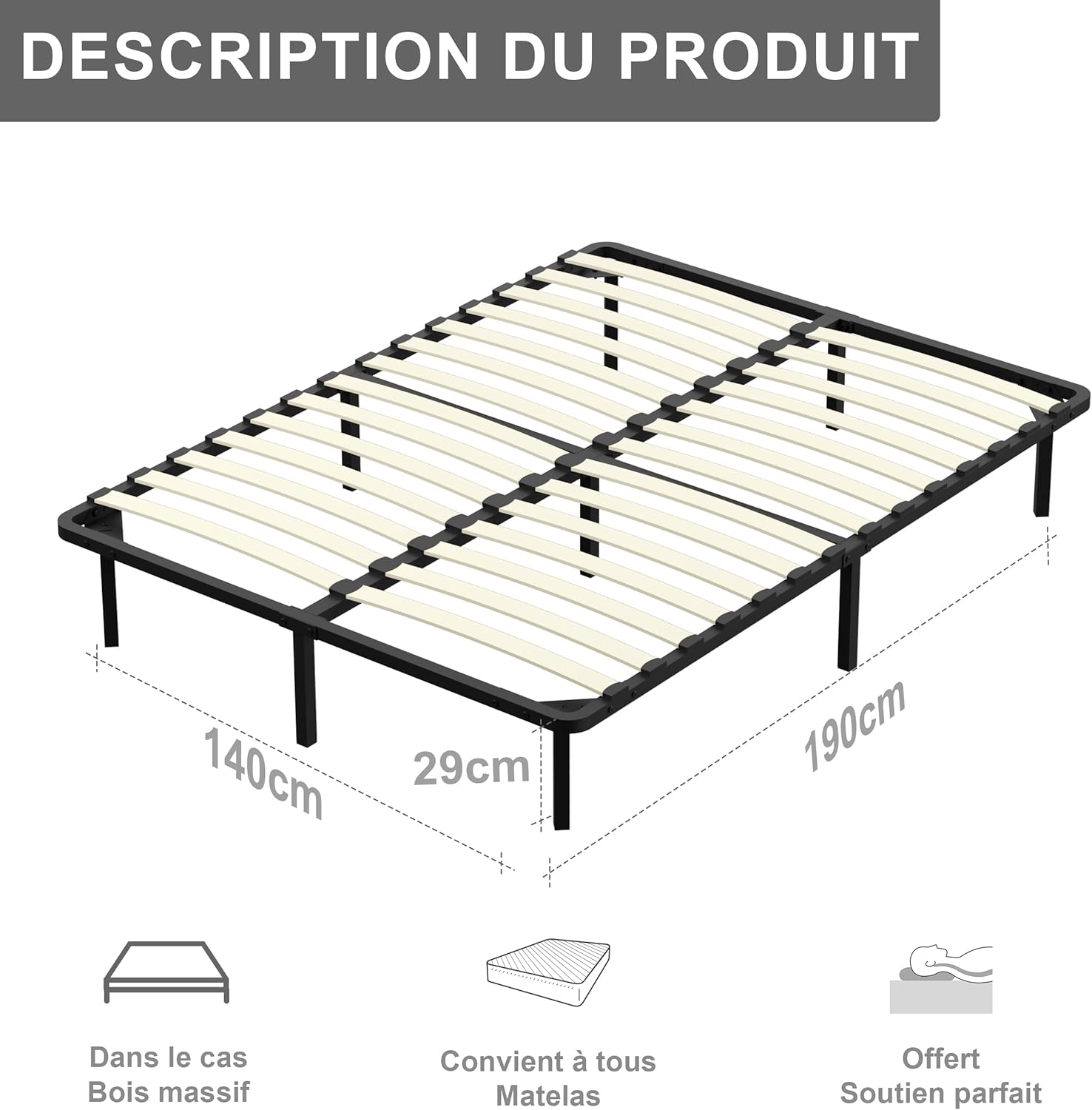 Sommier à lattes sur pieds 140 x 190 cm;Mesure – 140 x 190 cm;Matière – Lattes en bois;Structure – Acier renforcé. Pieds en Acier;Livré avec 9 pieds (environ 26cm) – 14 lattes
