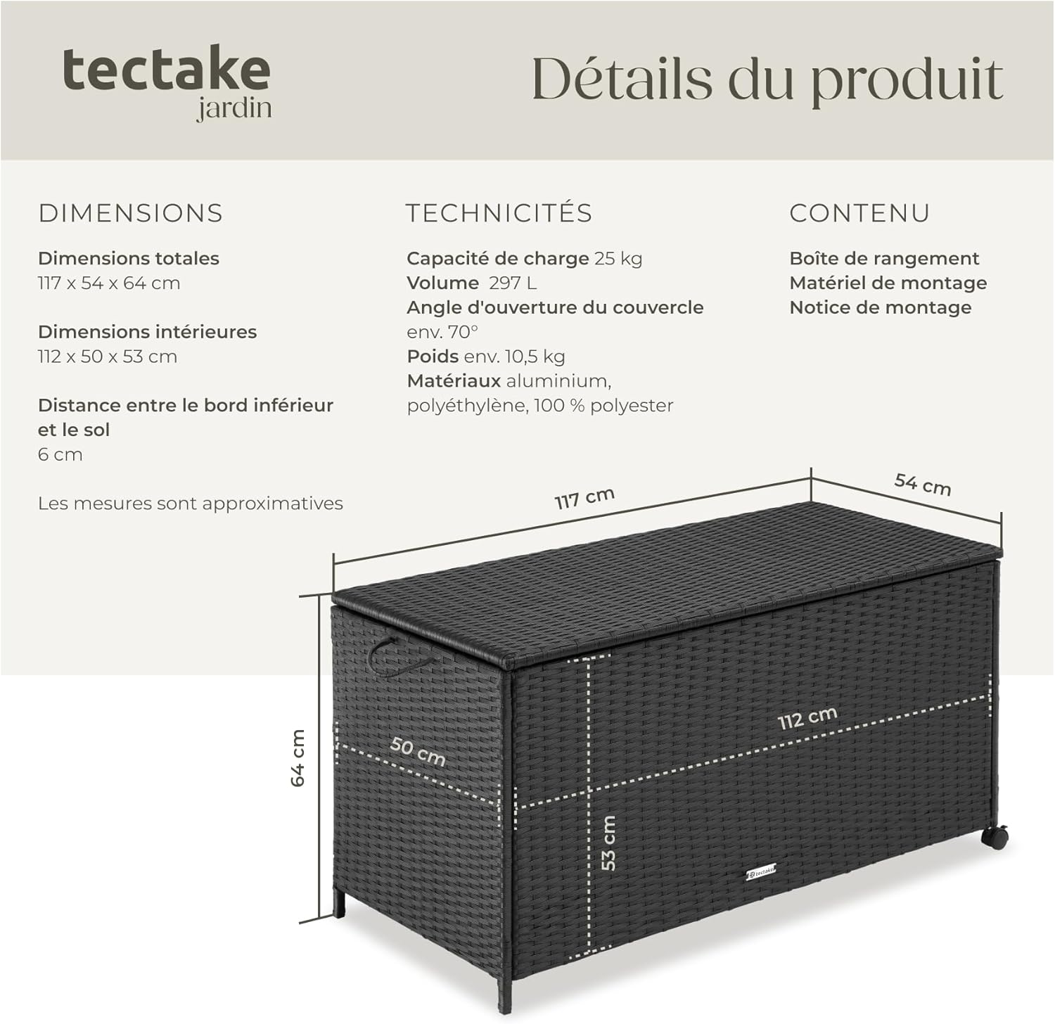 Dimensions totales (LxPxH) : environ 117 x 54 x 64 cmDimensions intérieures (LxPxH) : environ 112 x 50 x 53 cmAngle d’ouverture : environ 70°Diamètre des montants : environ 1,5 x 1,5 cmDistance entre le dessous de la boîte de rangement et le sol : environ 6 cmRoues (ØxL) : environ 4 x 3,5 cmPieds (LxP) : environ 1,5 x 1,5 cm