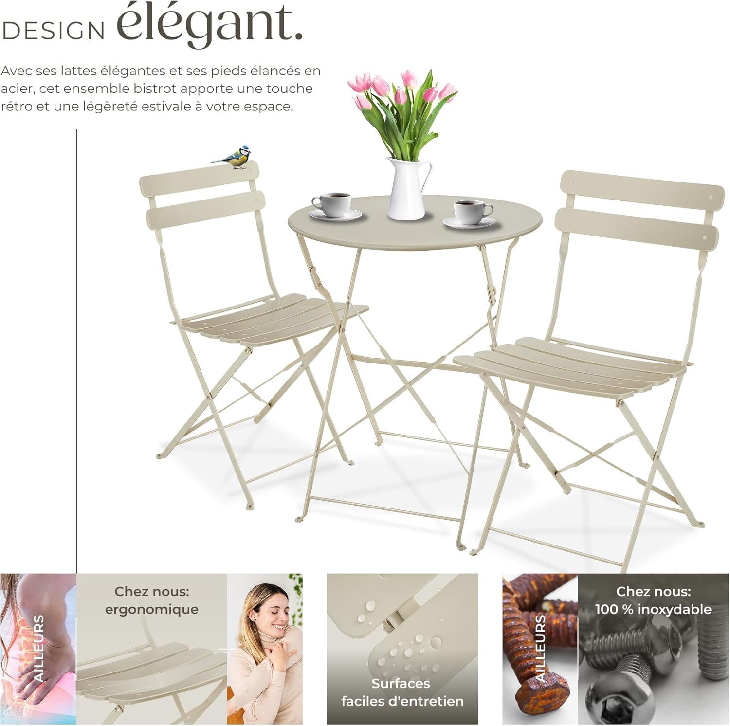 L’ensemble est également très facile d’entretien et simple à nettoyer. La haute résistance et la durabilité des matériaux vous garantissent des années de plaisir avec votre set de table bistrot. Que vous souhaitiez savourer un café le matin ou profiter d’un dîner en plein air : la table pliante et les chaises vous offrent la combinaison parfaite de style et de fonctionnalité.