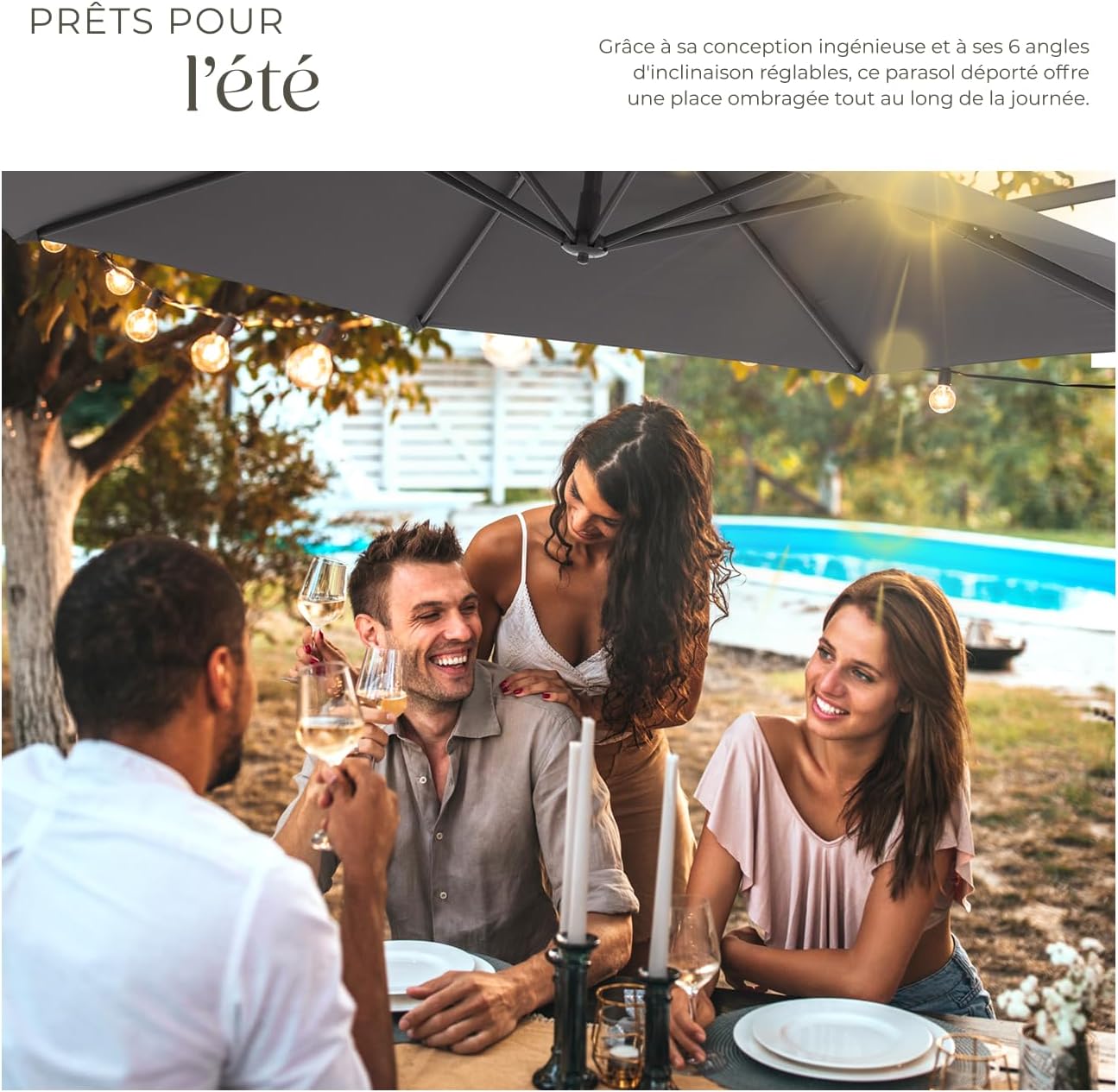 Points forts Parasol avec mât latéral pratique Mécanisme d’ouverture et de fermeture facile avec manivelle Protection UV 50+ 6 niveaux d’inclinaison réglables le long du mât Rotatif à 360° avec une pédale Haute stabilité et construction robuste Toile déperlante avec toit coupe-vent Housse de protection avec cordon de serrage incluse