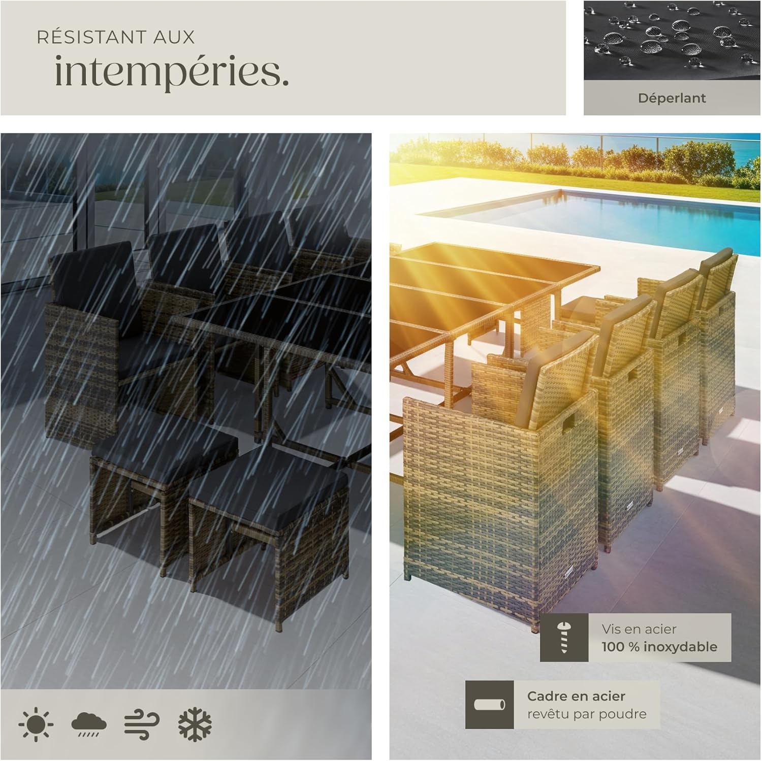 TOUJOURS PROTÉGÉ, PEU IMPORTE LA MÉTÉO: Chaque salon de jardin exterieur en resine vient avec une housse de protection incluse, garantissant que votre mobilier jardin exterieur reste impeccable. Soleil, pluie ou neige, votre salon jardin resine tressee encastrable est prêt à affronter chaque saison sans faiblir.