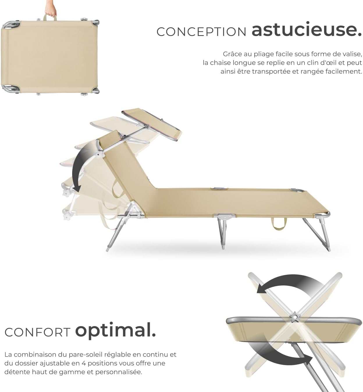 Chaise longue en acier de haute qualité avec pare-soleil intégré. Idéal pour le bain de soleil dans votre jardin ou sur la plage dans un confort assuré. Ce transat, facilement transportable est le compagnon idéal pour se détendre, se reposer et profiter de vacances bien méritées sous le soleil.
