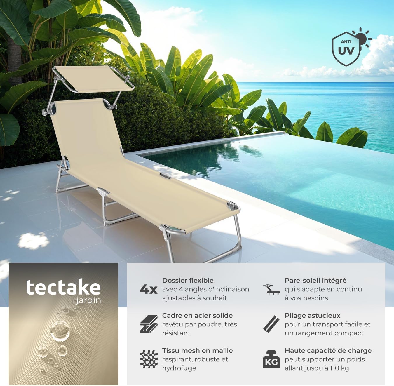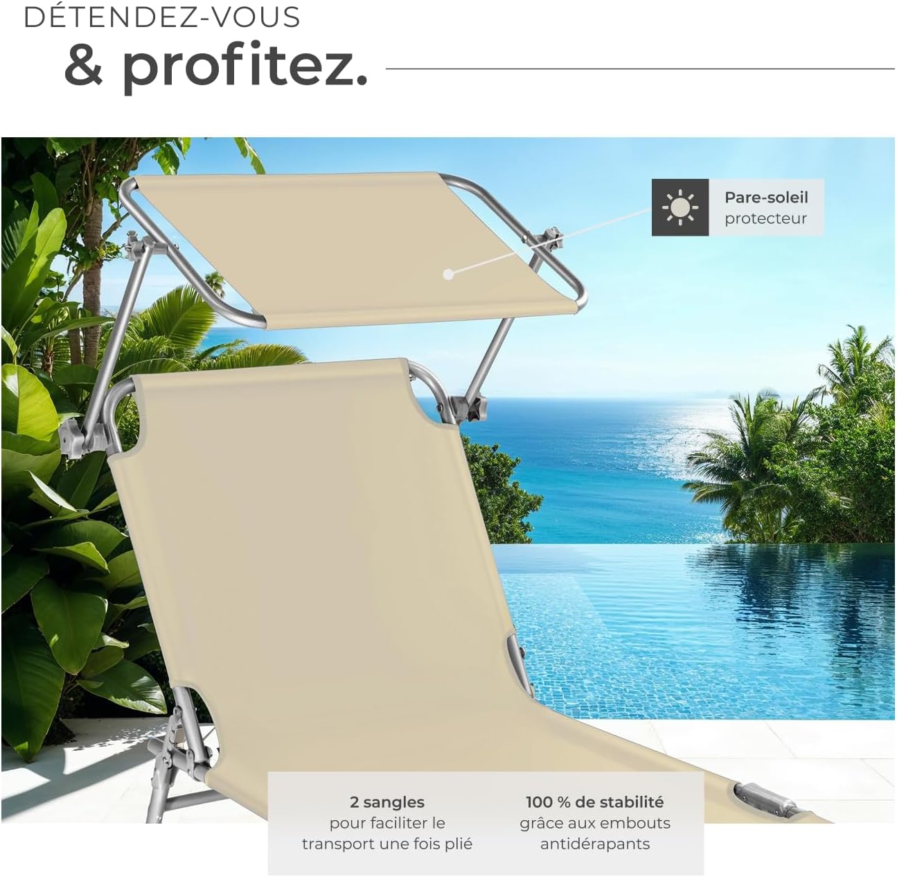 – 2 x chaise longue de jardin, multi positions pliable avec pare-soleil intégré