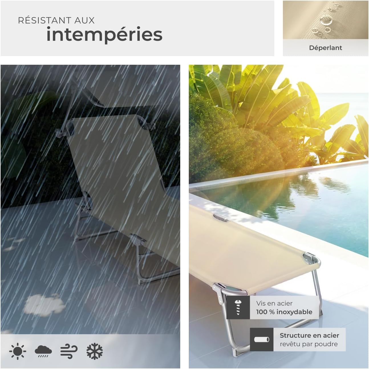 ROBUSTESSE ET RÉSISTANCE : Conçues pour résister aux caprices du temps, nos chaises longues jardin exterieur disposent d’une structure en acier résistant aux intempéries et supportant une charge de 110 kg. Ces bains de soleil jardin exterieur vous promettent des années de relax jardin exterieur et de détente sur votre transat piscine ou transat balcon.
