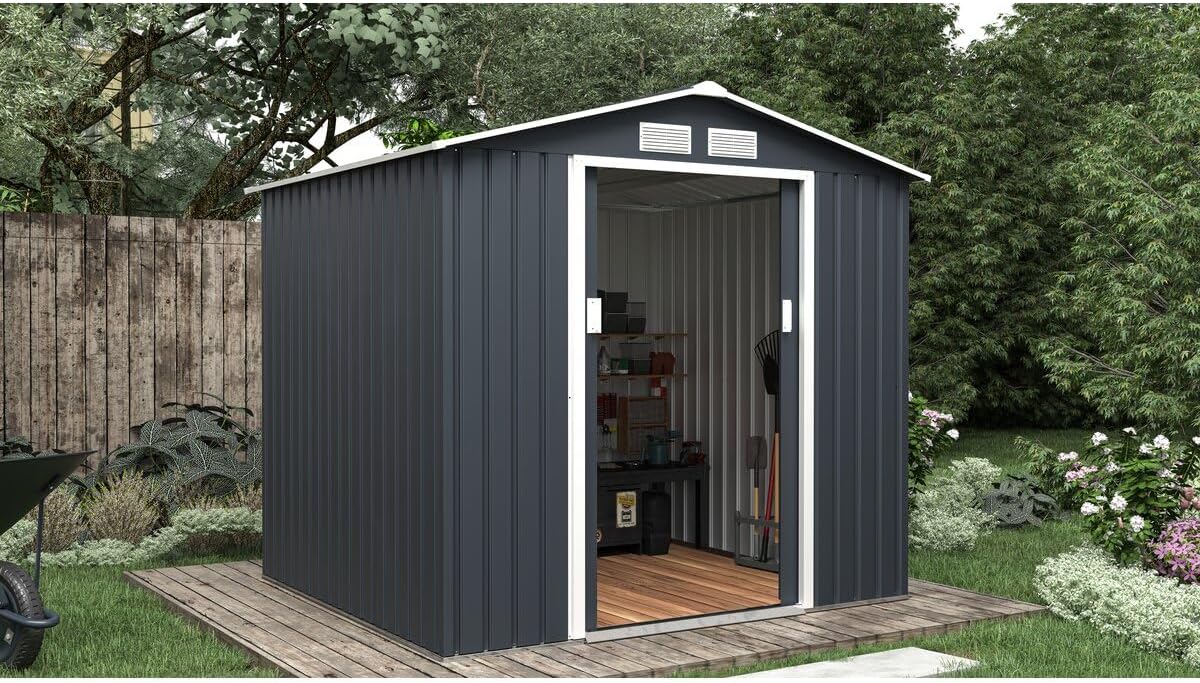 Abri de jardin Vegas – En acier galvanisé – Dimensions hors-tout : – Grilles d’aération – Double porte coulissante – Résiste aux UV et à la rouille – Base/fondation non inclus – Gris.