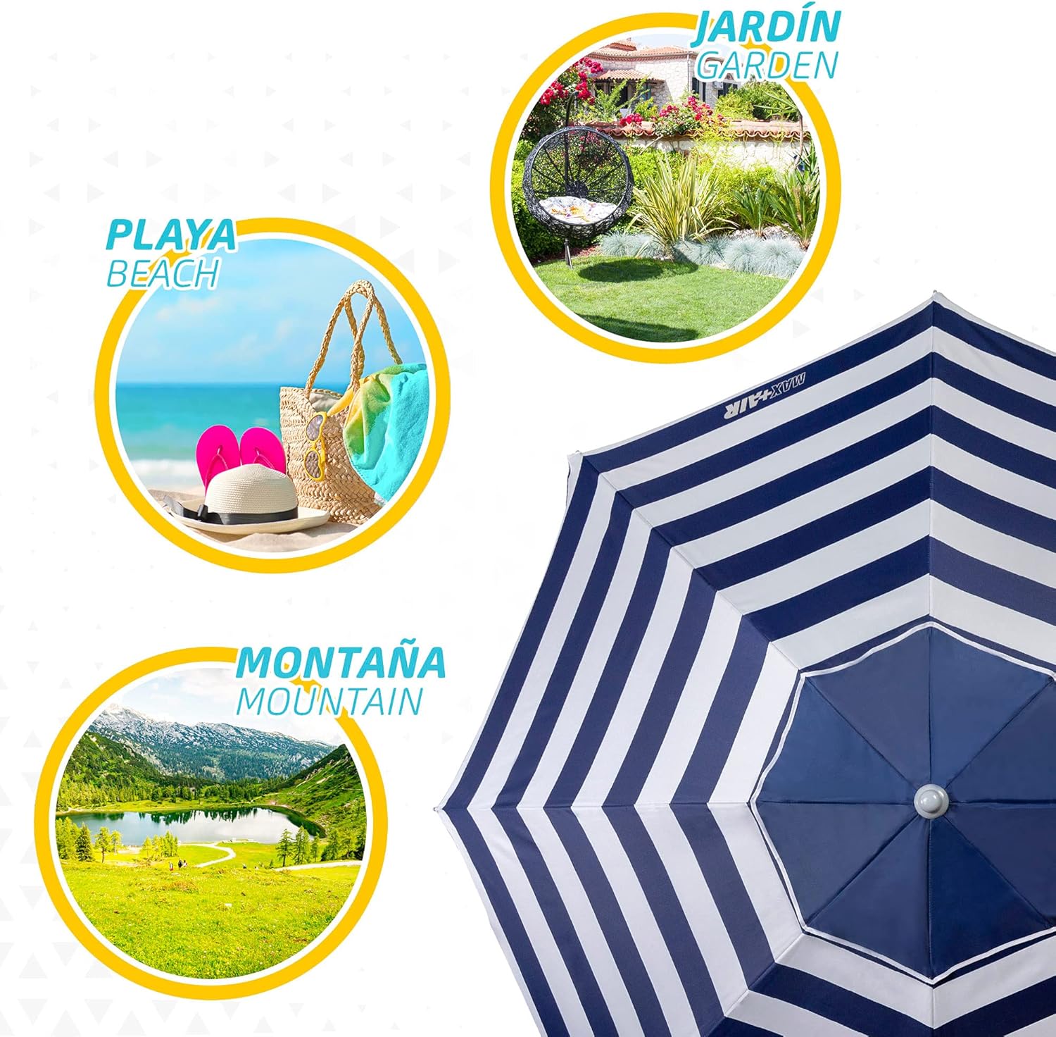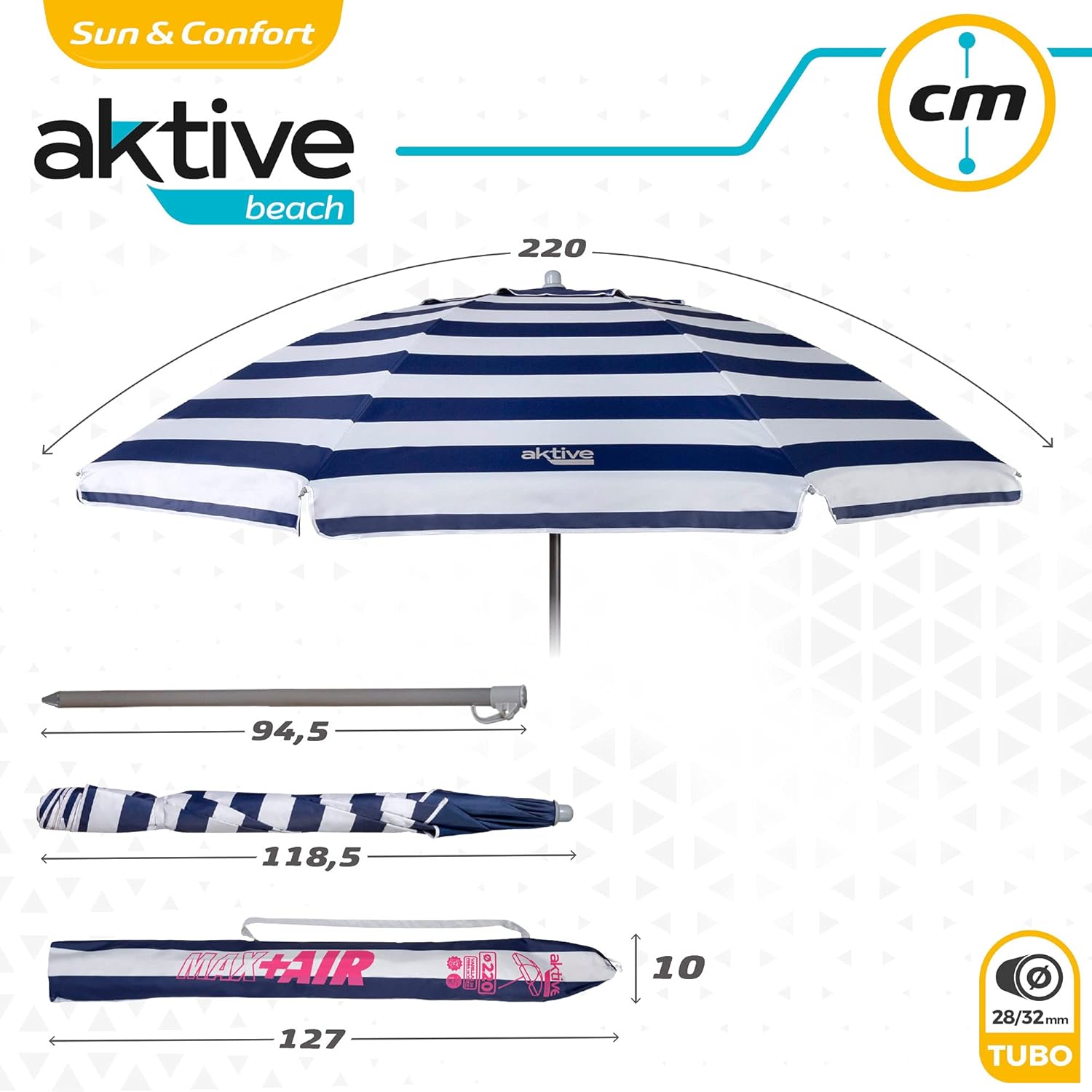 Ce parasol au motif marin rayé marine et blanc a un arc de 220 cm et un mât réglable en hauteur de 28 à 32 mm. Le parasol est fabriqué en polyester de haute qualité avec une protection UV50, une toile ventilée et une doublure intérieure argentée. La structure en aluminium est composée de 8 tiges en fibre de verre qui soutiennent la toile et d’un mât flexible qui guide l’ombre. Le parasol est livré avec un sac de rangement avec poignée.