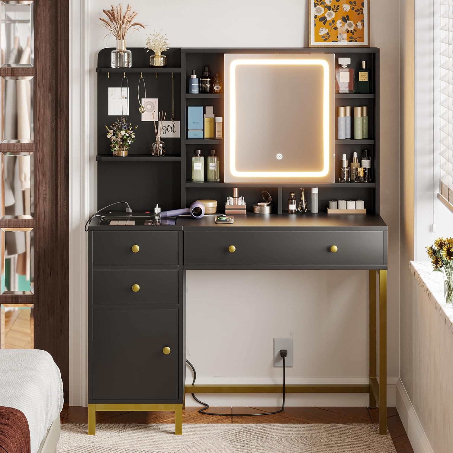 AOGLLATI Coiffeuse avec Miroir LED à luminosité réglable, 4 tiroirs et 12 Compartiments, Table de Maquillage en Bois avec 3 Modes d’éclairage, avec multipris et tiroir visuel