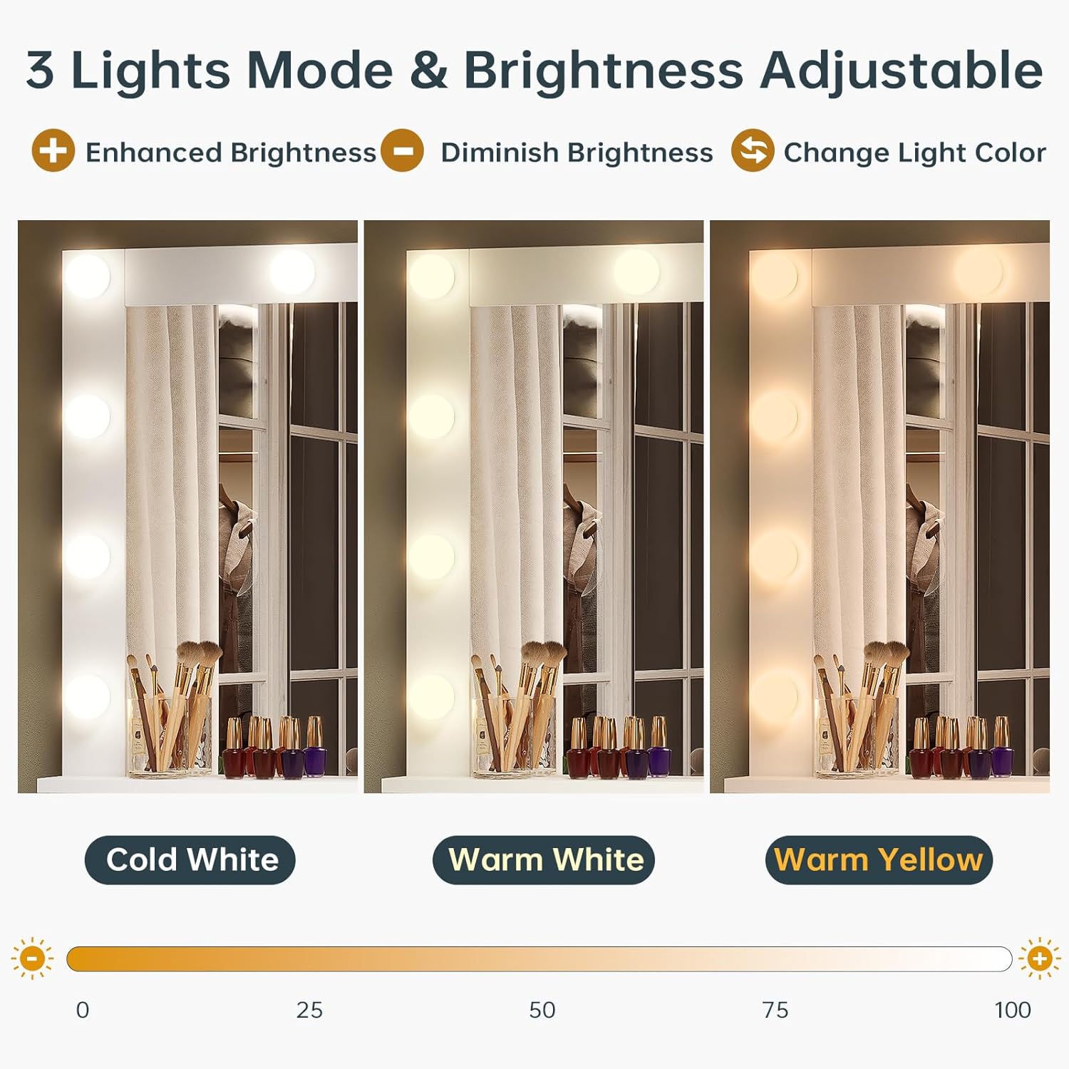 【10 ampoules Hollywood avec 3 modes d’éclairage】Cette coiffeuse avec rangement est équipée de 10 ampoules Hollywood, qui sont suffisamment lumineuses pour vous donner une vision claire de votre visage tout en offrant un éclairage uniforme. Cette coiffeuse dispose également de 3 modes d’éclairage : la lumière blanche froide, la lumière blanche chaude et la lumière jaune chaude. Vous pouvez régler la luminosité et le mode d’éclairage en fonction de vos besoins, parfait pour le maquillage et la Webdiffusion en direct.