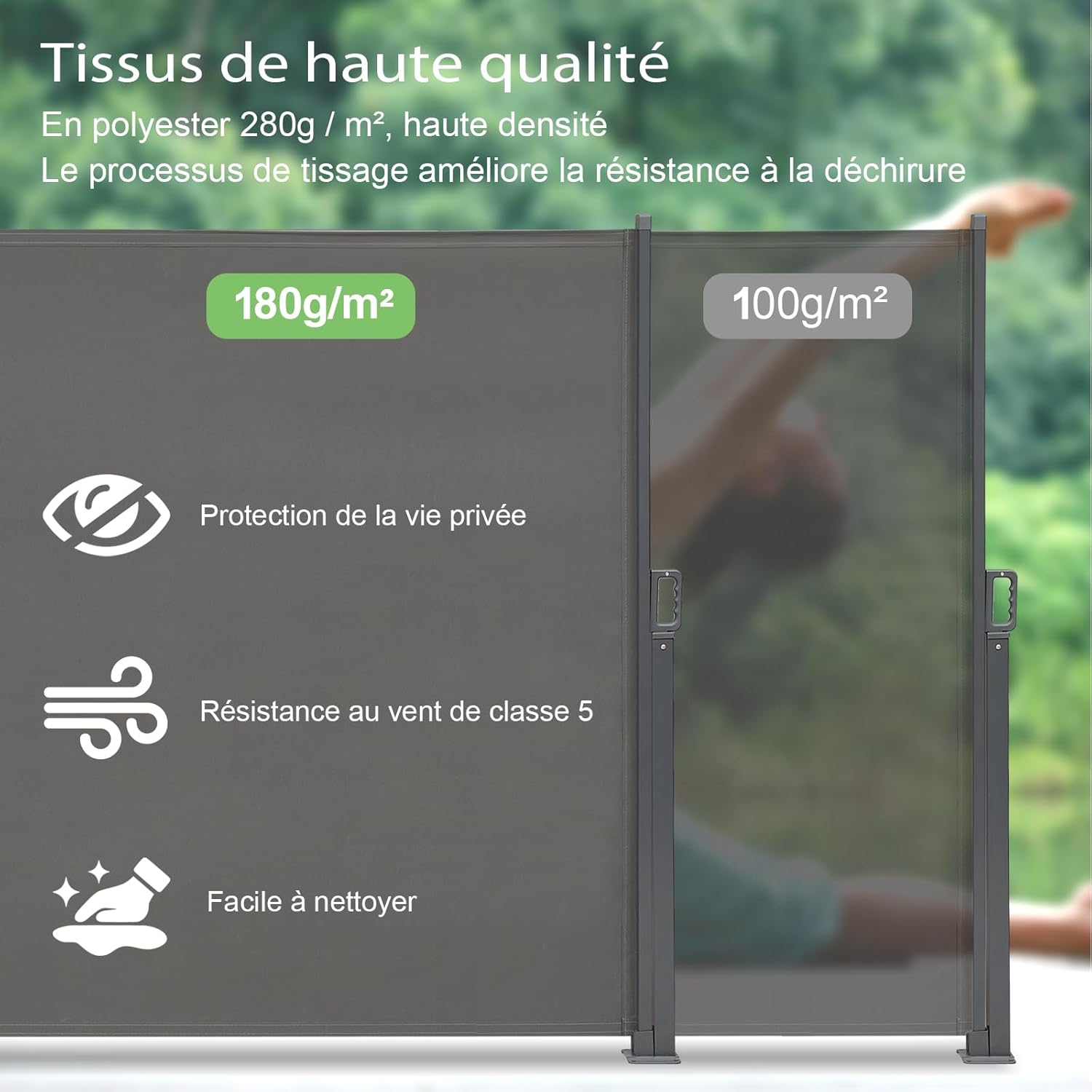 Protection d’intimité maximale : Le tissu du store latéral rétractable offre une intimité optimale avec sa densité de 180 g/m², empêchant les regards indiscrets et créant un espace extérieur privé.