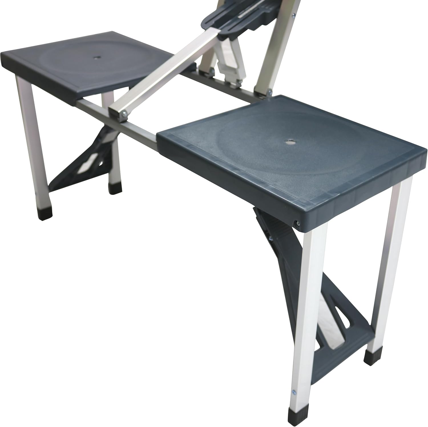TABLE VALISE PIQUE-NIQUE Stucture aluminium anodisé 85 x 65 x 67 cm Se replie en mallette avec les 4 sièges solidaires à l’intérieur. Faible volume de rangement. Trou central pour parasol. 6,5 kg