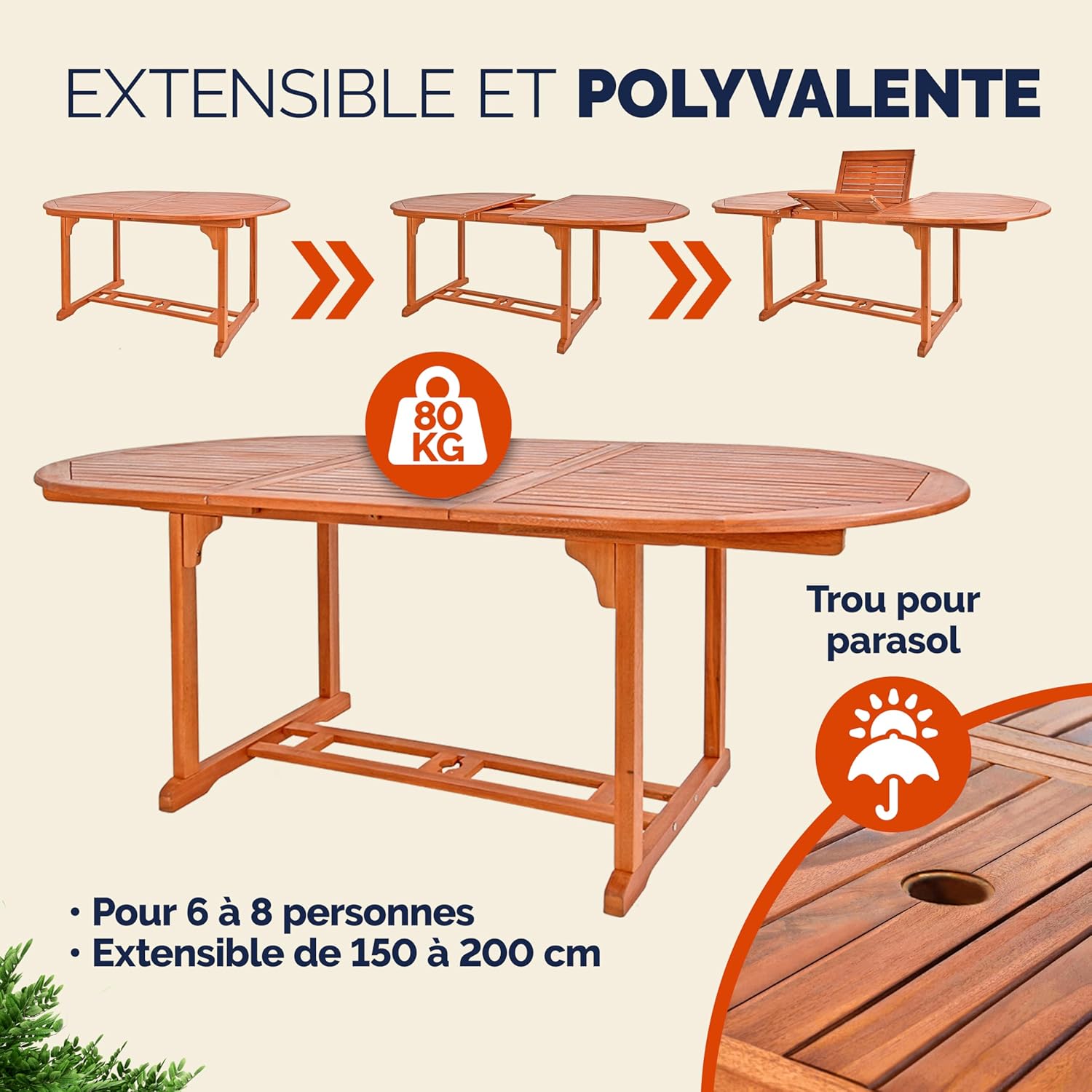 FACILE D’UTILISATION : Le plateau de table de 150 cm peut être facilement étendue à 200 cm grâce au système Butterfly. Celui-ci s’accorde à tes besoins et peut accueillir entre 6 et 8 personnes. Il est également possible d’ajouter un parasol au centre de la table, un emplacement y est réservé.