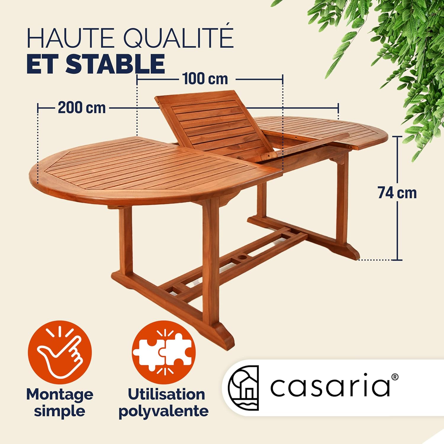 CARACTÉRISTIQUES TECHNIQUES : Dimensions de la table dépliée : Longueur 200 cm x Largeur 100 cm x Hauteur 74 cm – Dimensions de la table pliée : Longueur 150 cm
